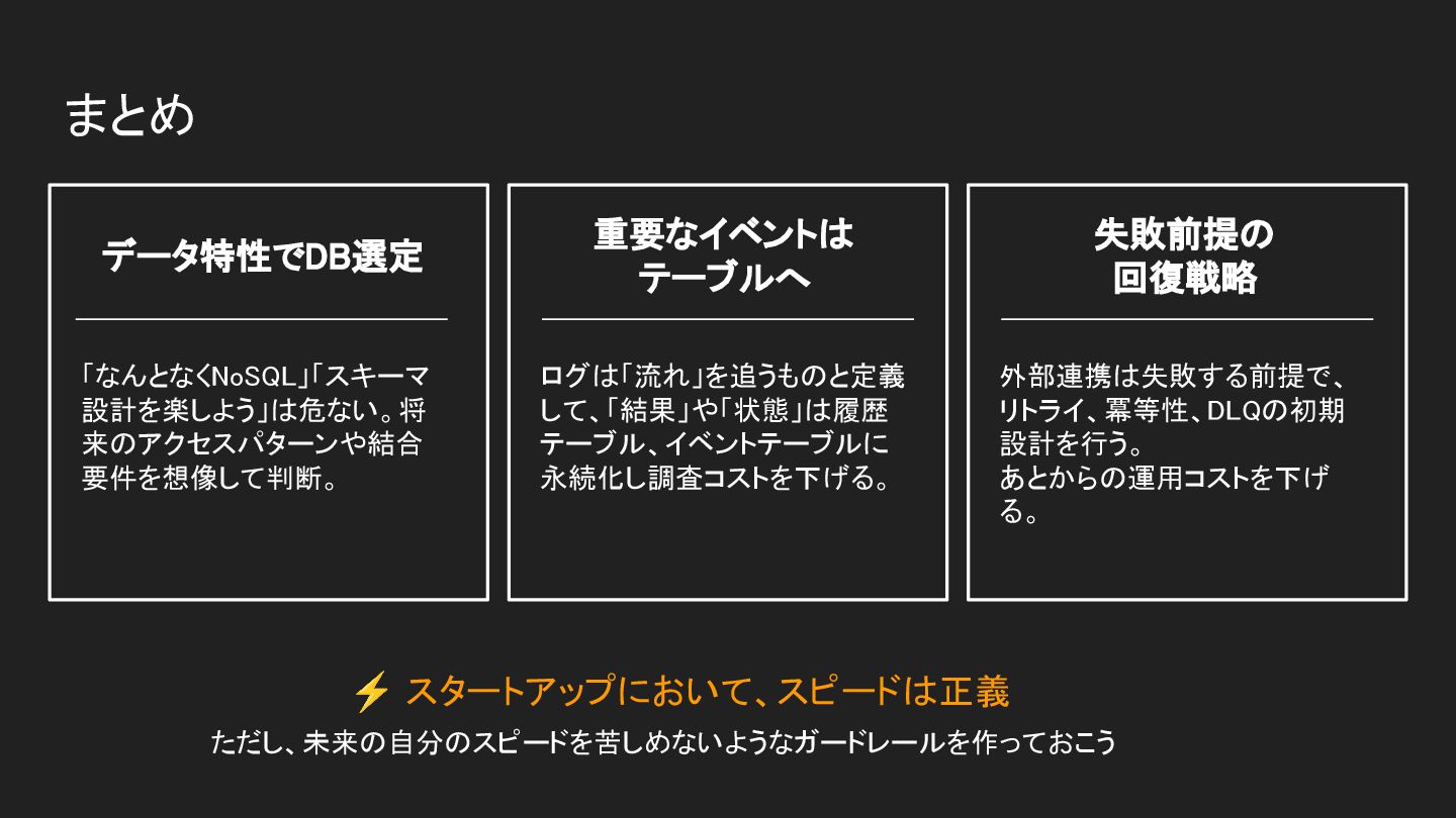 「なんとなくNoSQL」「スキーマ 設計を楽しよう」は危ない。将 来のアクセスパターンや結合 要件を想像して判断。 ログは「流れ」を追うものと定義 して、「結果」や「状態」は履歴 テーブル、イベントテーブルに 永続化し調査コストを下げる。 外部連携は失敗する前提で、 リトライ、冪等性、DLQの初期 設計を行う。 あとからの運用コストを下げ る。 ⚡ スタートアップにおいて、スピードは正義 ただし、未来の自分のスピードを苦しめないようなガードレールを作っておこう