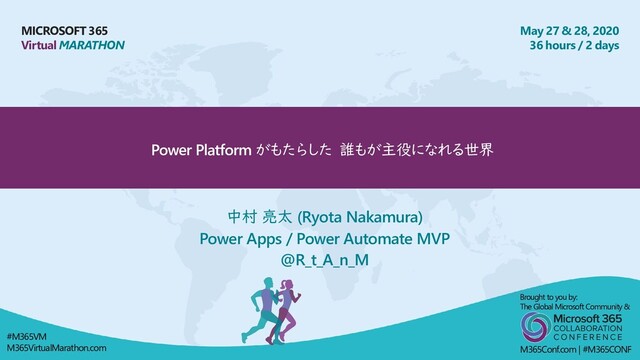 hours / 2 days Power Platform がもたらした 誰もが主役になれる世界 中村 亮太 (Ryota Nakamura) Power Apps / Power Automate MVP @R_t_A_n_M Brought to you by: The Global Microsoft Community & M365Conf.com | #M365CONF #M365VM M365VirtualMarathon.com