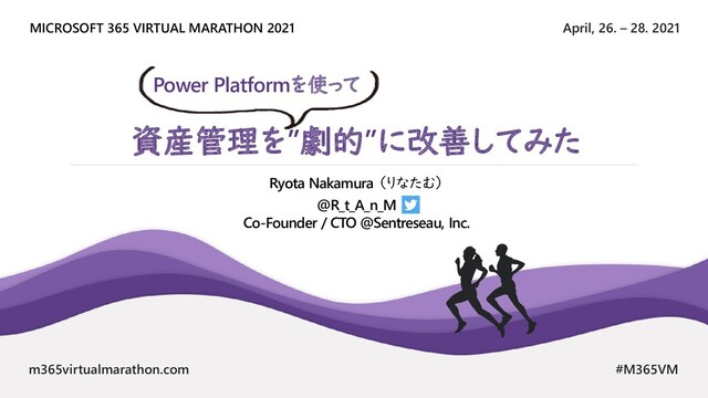 m365virtualmarathon.com #M365VM 資産管理を”劇的”に改善してみた Ryota Nakamura (りなたむ) @R_t_A_n_M Co-Founder / CTO @Sentreseau, Inc. Power Platformを使って
