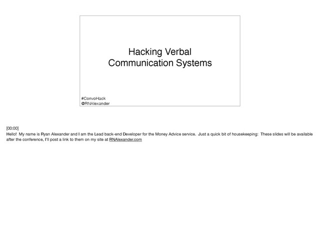 is Ryan Alexander and I am the Lead back-end Developer for the Money Advice service. Just a quick bit of housekeeping: These slides will be available after the conference, I’ll post a link to them on my site at RNAlexander.com