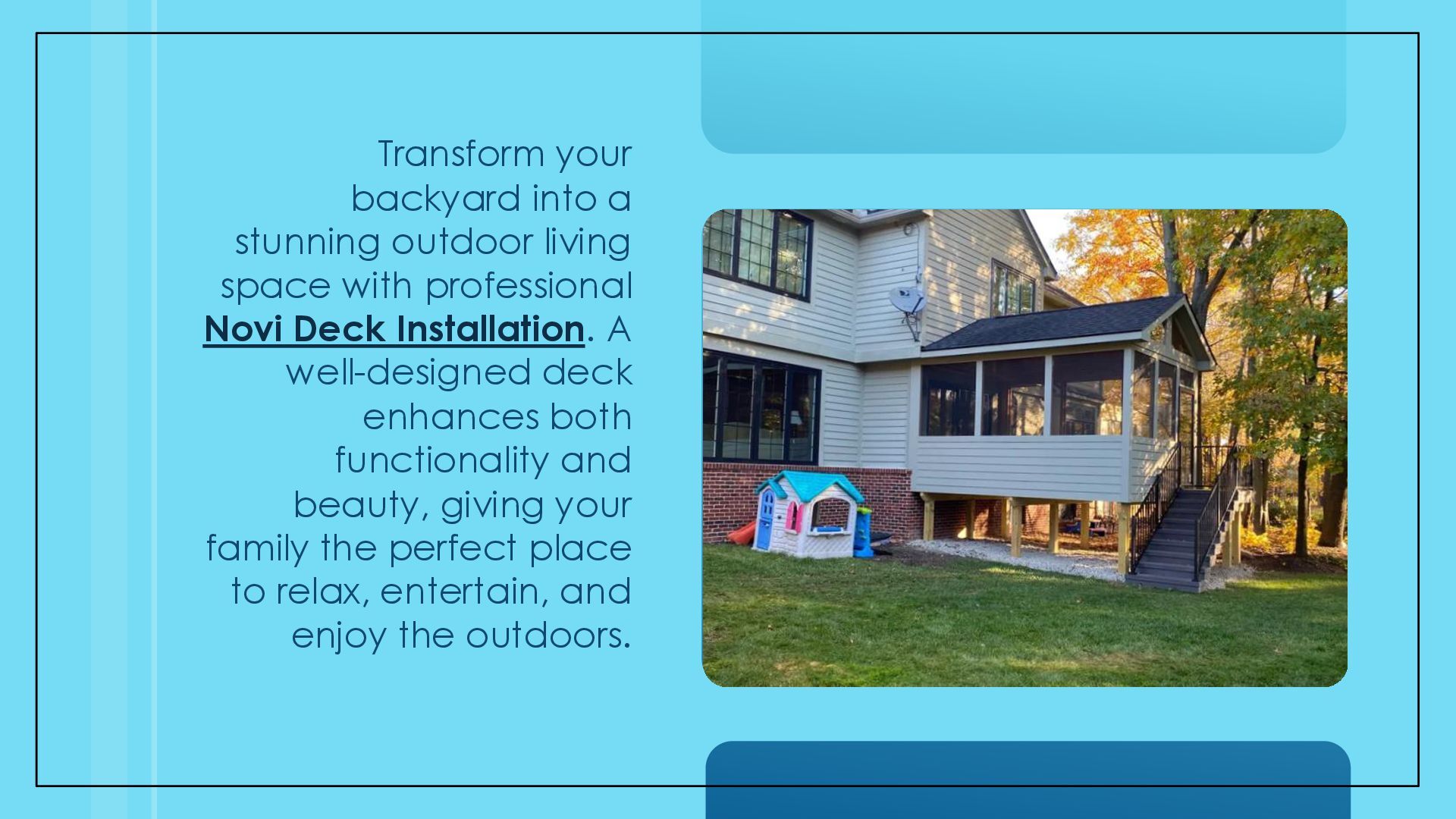 "Discover how professional Novi Deck Installation can transform your outdoor living space into a functional and stylish retreat. From custom designs to durable materials, this guide explains the benefits of hiring experts for your deck project. With the trusted team at RN Construction, you’ll enjoy lasting quality, enhanced curb appeal, and a seamless installation process tailored to your lifestyle." For more info:- https://yourcustomdeck.com/novi/