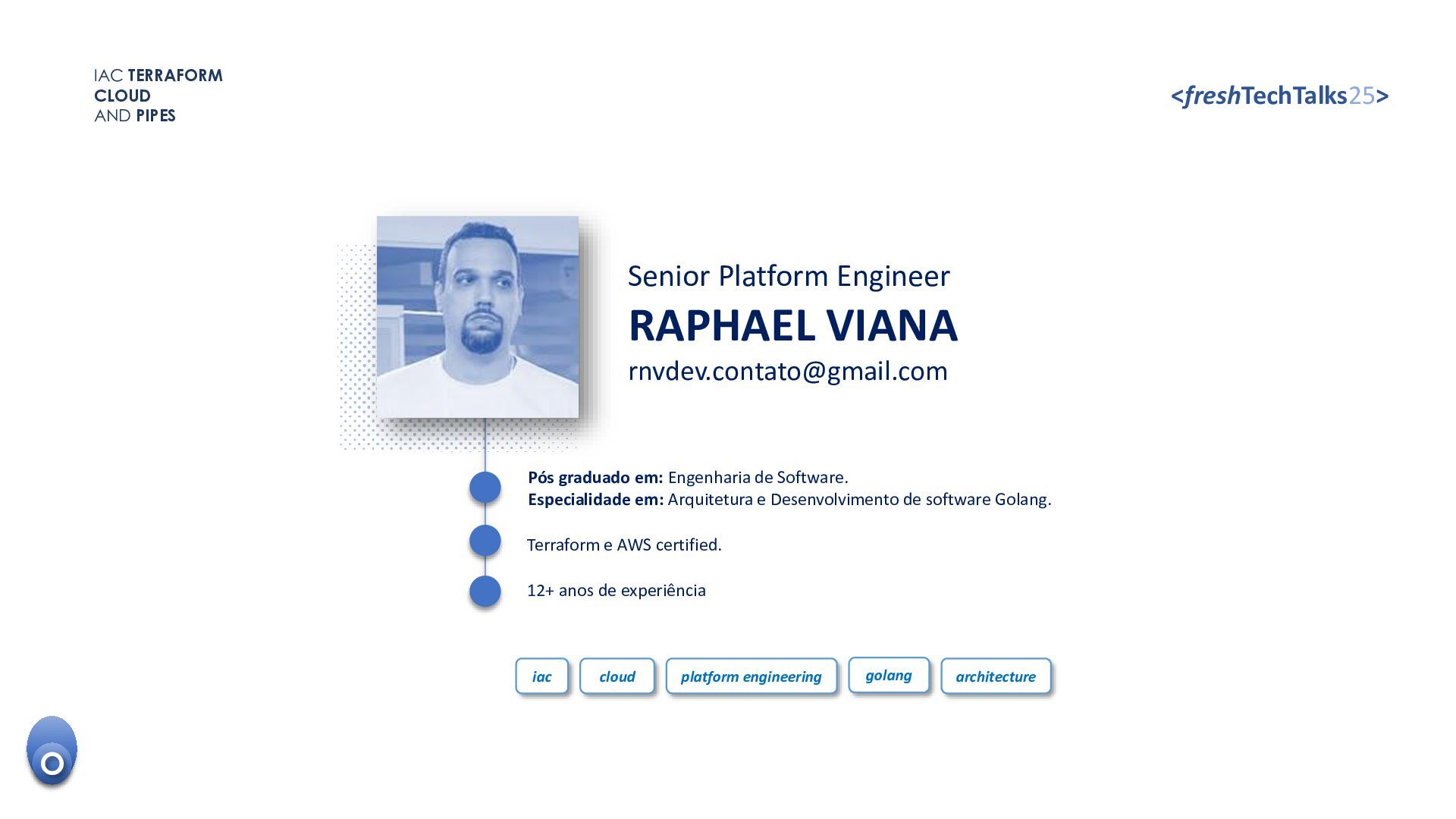 VIANA [email protected] iac cloud platform engineering golang Pós graduado em: Engenharia de Software. Especialidade em: Arquitetura e Desenvolvimento de software Golang. Terraform e AWS certified. 12+ anos de experiência architecture O