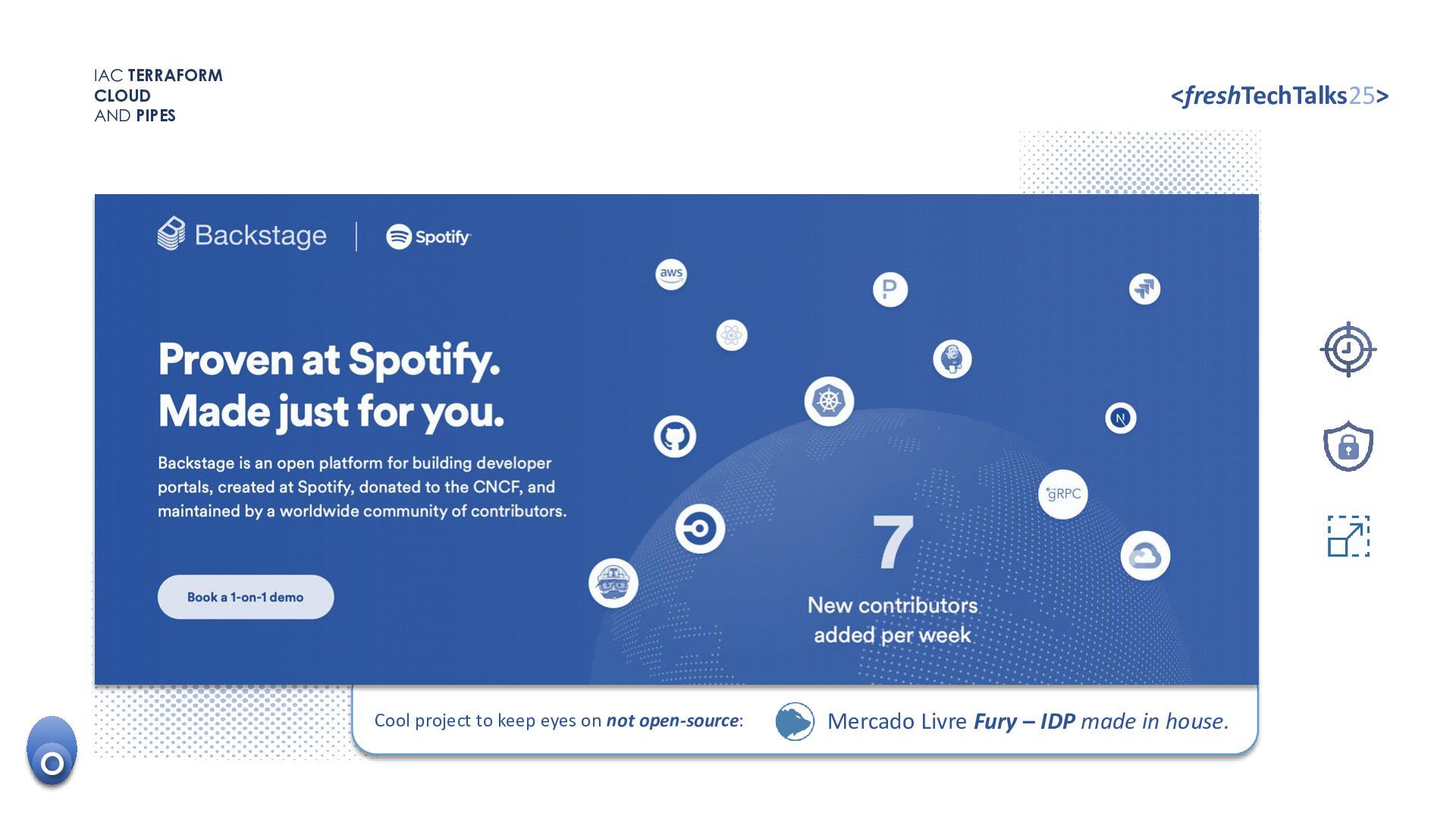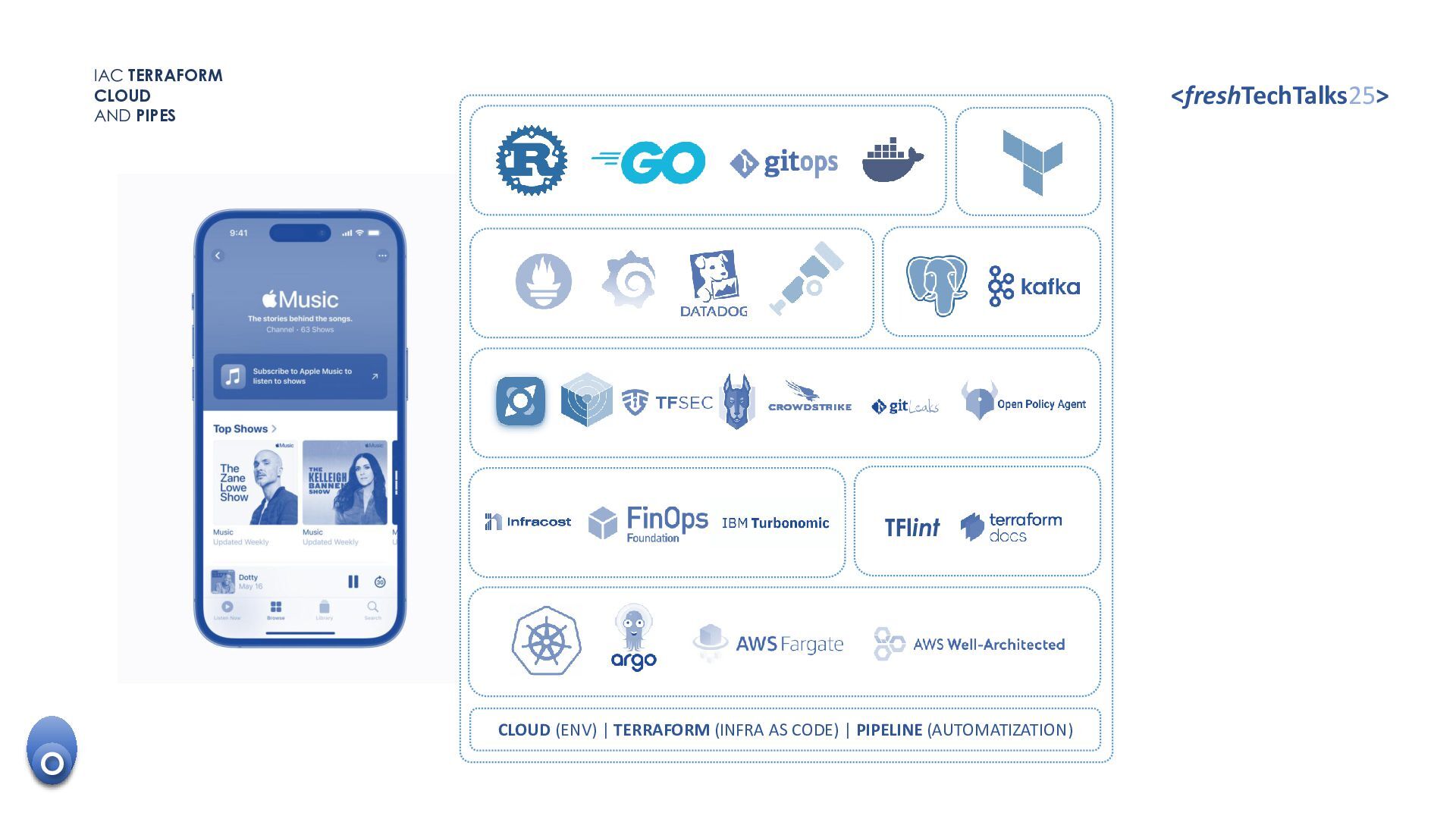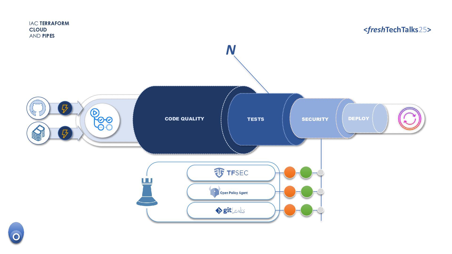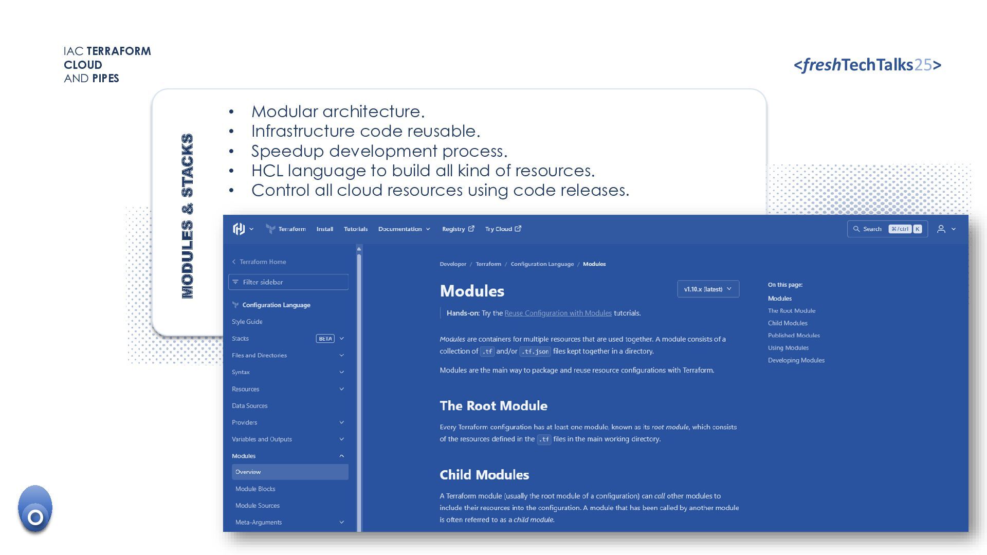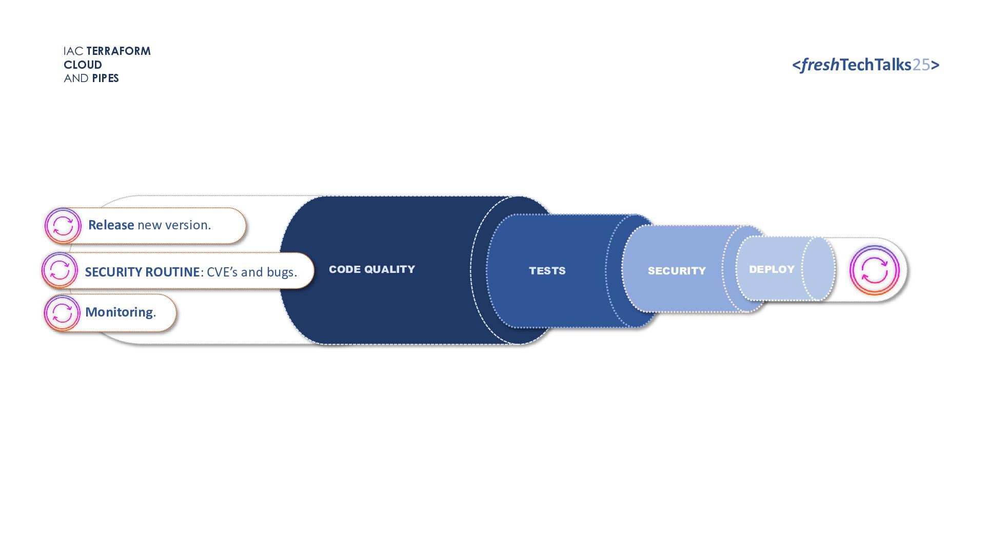 • Versoning code. • Code release control. TFlint TOOLS SUPERCHARGER CLOUD KNOW-HOW The development process. IAC TERRAFORM CLOUD AND PIPES <freshTechTalks25> CODE SKILL • Resources dependencies and relationships. • Best practices of architecture. O