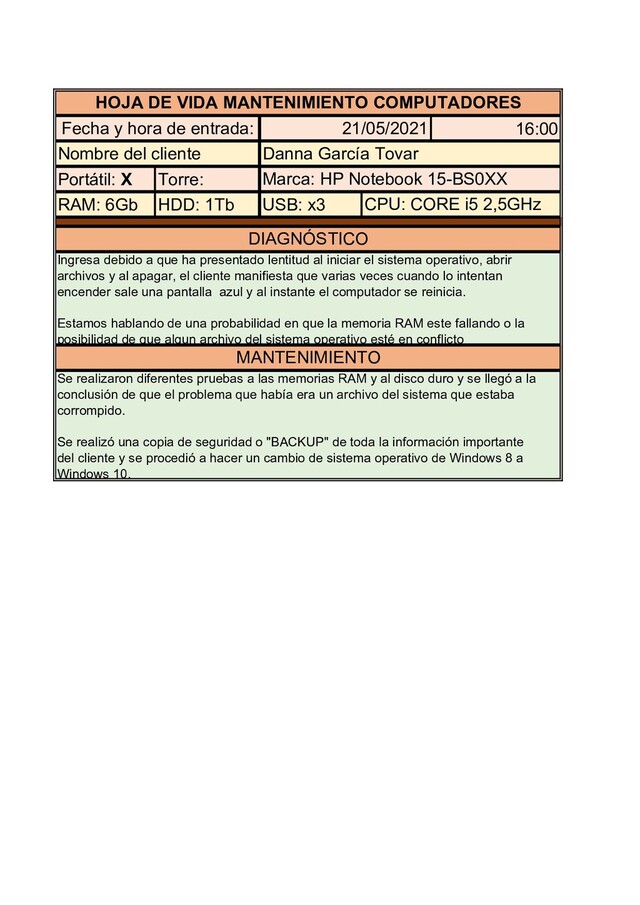 DIAGNÓSTICO Ingresa debido a que ha presentado lentitud al iniciar el sistema operativo, abrir archivos y al apagar, el cliente manifiesta que varias veces cuando lo intentan encender sale una pantalla azul y al instante el computador se reinicia. Estamos hablando de una probabilidad en que la memoria RAM este fallando o la posibilidad de que algun archivo del sistema operativo esté en conflicto MANTENIMIENTO Se realizaron diferentes pruebas a las memorias RAM y al disco duro y se llegó a la conclusión de que el problema que había era un archivo del sistema que estaba corrompido. Se realizó una copia de seguridad o "BACKUP" de toda la información importante del cliente y se procedió a hacer un cambio de sistema operativo de Windows 8 a Windows 10. Marca: HP Notebook 15-BS0XX Danna García Tovar CPU: CORE i5 2,5GHz 21/05/2021 HOJA DE VIDA MANTENIMIENTO COMPUTADORES Fecha y hora de entrada: Nombre del cliente
