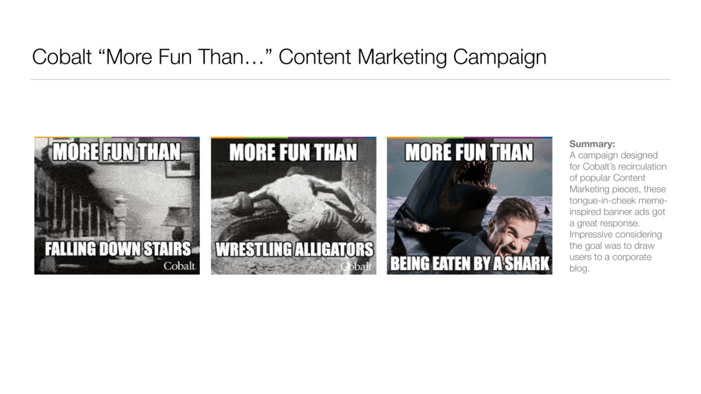 campaign designed for Cobalt’s recirculation of popular Content Marketing pieces, these tongue-in-cheek meme- inspired banner ads got a great response. Impressive considering the goal was to draw users to a corporate blog.
