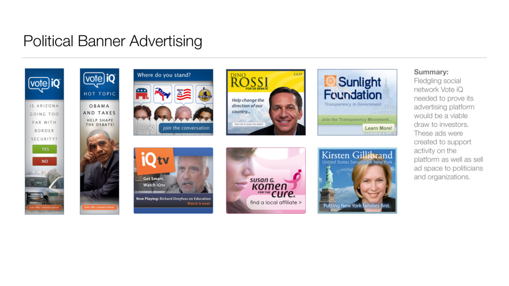 needed to prove its advertising platform would be a viable draw to investors. These ads were created to support activity on the platform as well as sell ad space to politicians and organizations.
