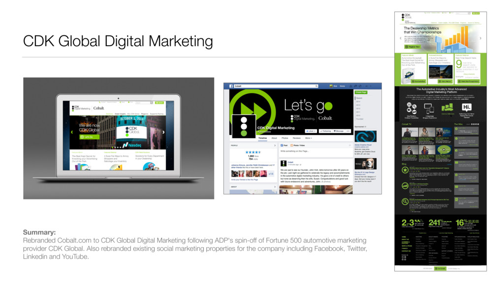 Global Digital Marketing following ADP's spin-off of Fortune 500 automotive marketing provider CDK Global. Also rebranded existing social marketing properties for the company including Facebook, Twitter, Linkedin and YouTube.