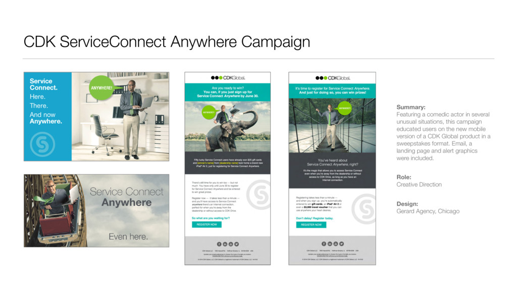 in several unusual situations, this campaign educated users on the new mobile version of a CDK Global product in a sweepstakes format. Email, a landing page and alert graphics were included. Role: Creative Direction Design: Gerard Agency, Chicago