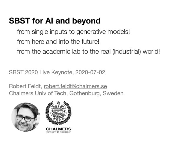 Robert Feldt, [email protected] Chalmers Univ of Tech, Gothenburg, Sweden from single inputs to generative models! from here and into the future! from the academic lab to the real (industrial) world!