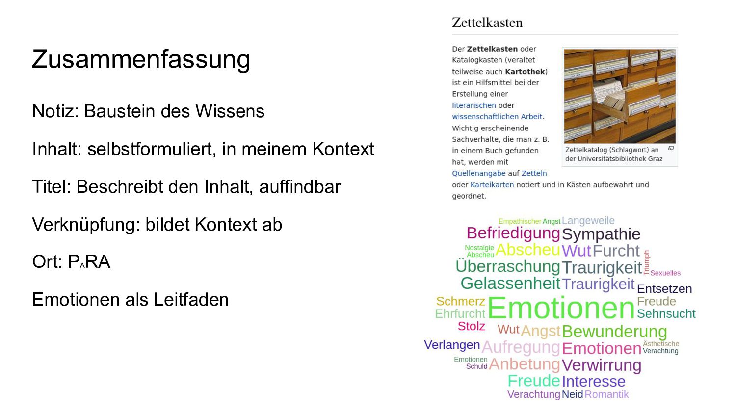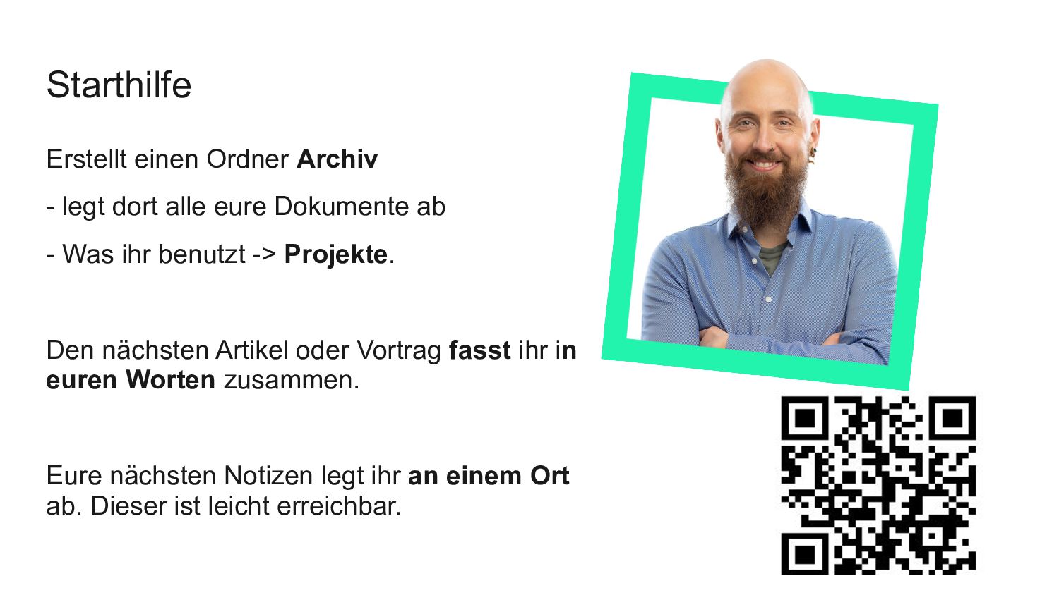 Dokumente ab - Was ihr benutzt -> Projekte. Den nächsten Artikel oder Vortrag fasst ihr in euren Worten zusammen. Eure nächsten Notizen legt ihr an einem Ort ab. Dieser ist leicht erreichbar.