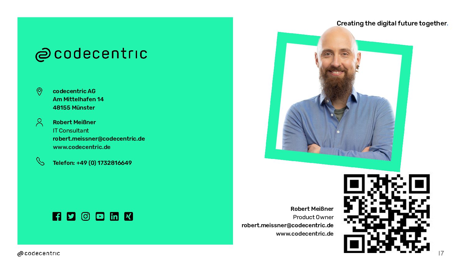 1732816649 Robert Meißner IT Consultant [email protected] www.codecentric.de Creating the digital future together. 17 Robert Meißner Product Owner [email protected] www.codecentric.de