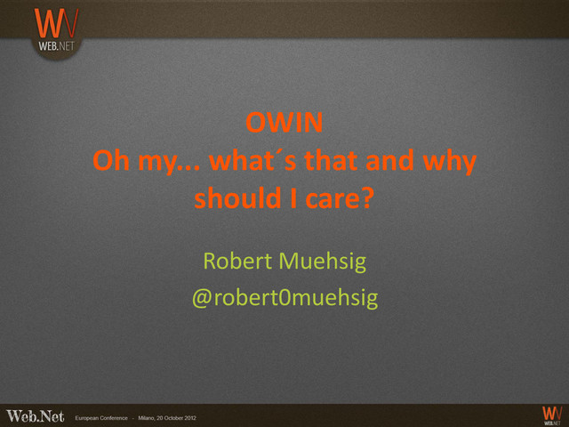 Learn more about the OWIN Spec, the development community around it and what frameworks are using it. In this talk I will give you a overview of the current state of OWIN, the idea behind it, the relationship with other Web Framework Stacks, implementations of OWIN in famous frameworks like NancyFx or SignalR and where you can host "OWIN-Apps".