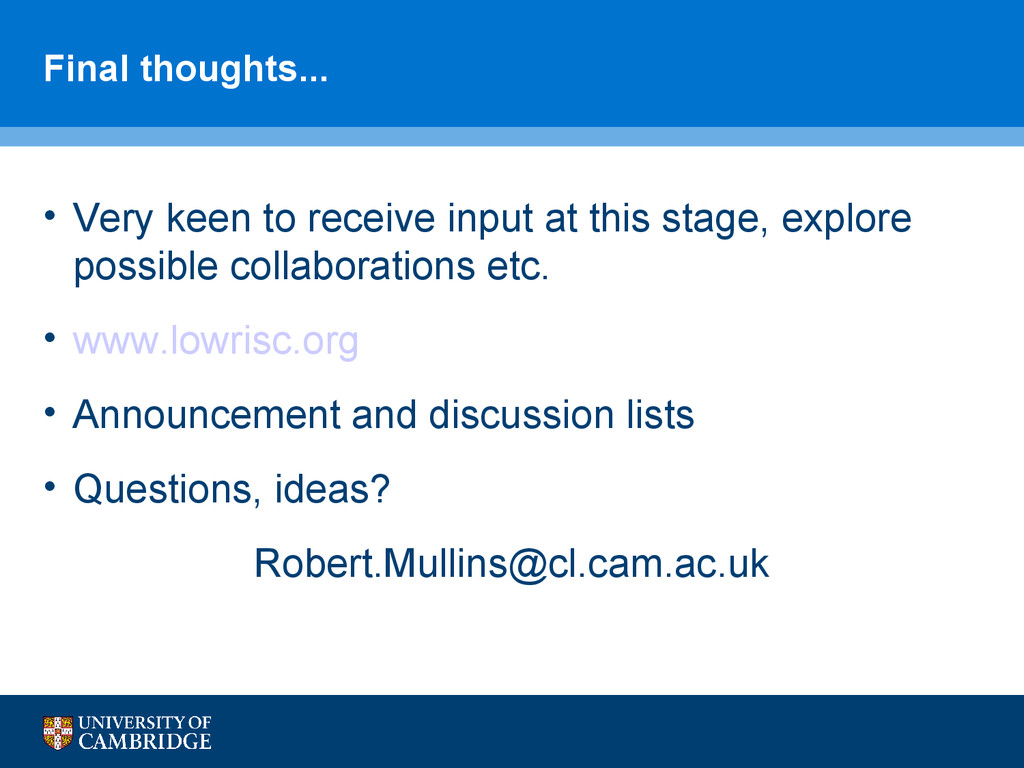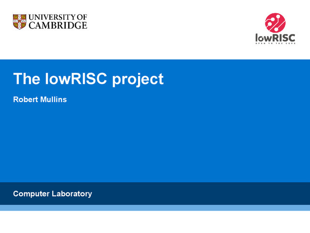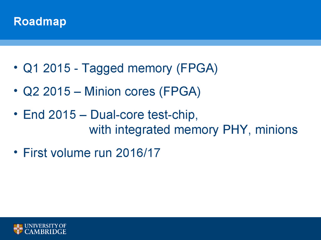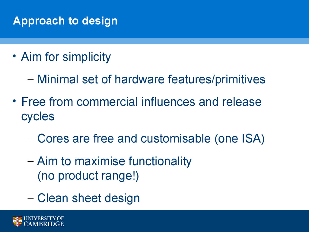 of hardware features/primitives • Free from commercial influences and release cycles – Cores are free and customisable (one ISA) – Aim to maximise functionality (no product range!) – Clean sheet design