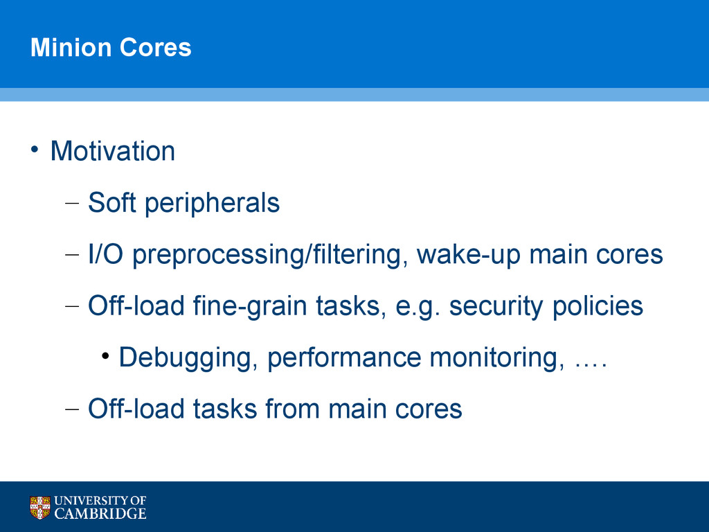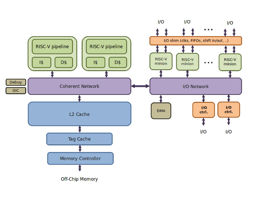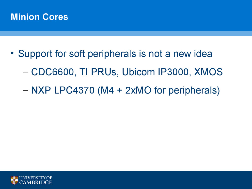 for precise timing • I/O 'shim' – Logic to aid shift in/out, parallel load, buffer data, provide clocks, assign pins to minions.. • Low-latency path between main cores and minions – May carry cache misses, branch mispredicts..