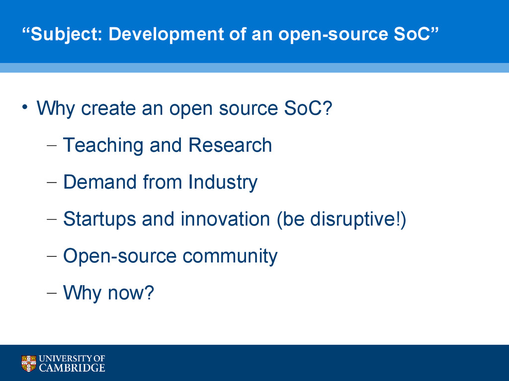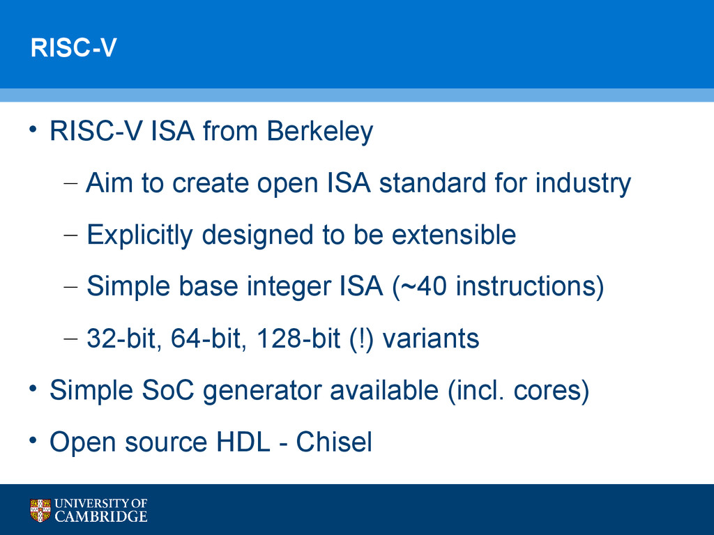 open ISA standard for industry – Explicitly designed to be extensible – Simple base integer ISA (~40 instructions) – 32-bit, 64-bit, 128-bit (!) variants • Simple SoC generator available (incl. cores) • Open source HDL - Chisel