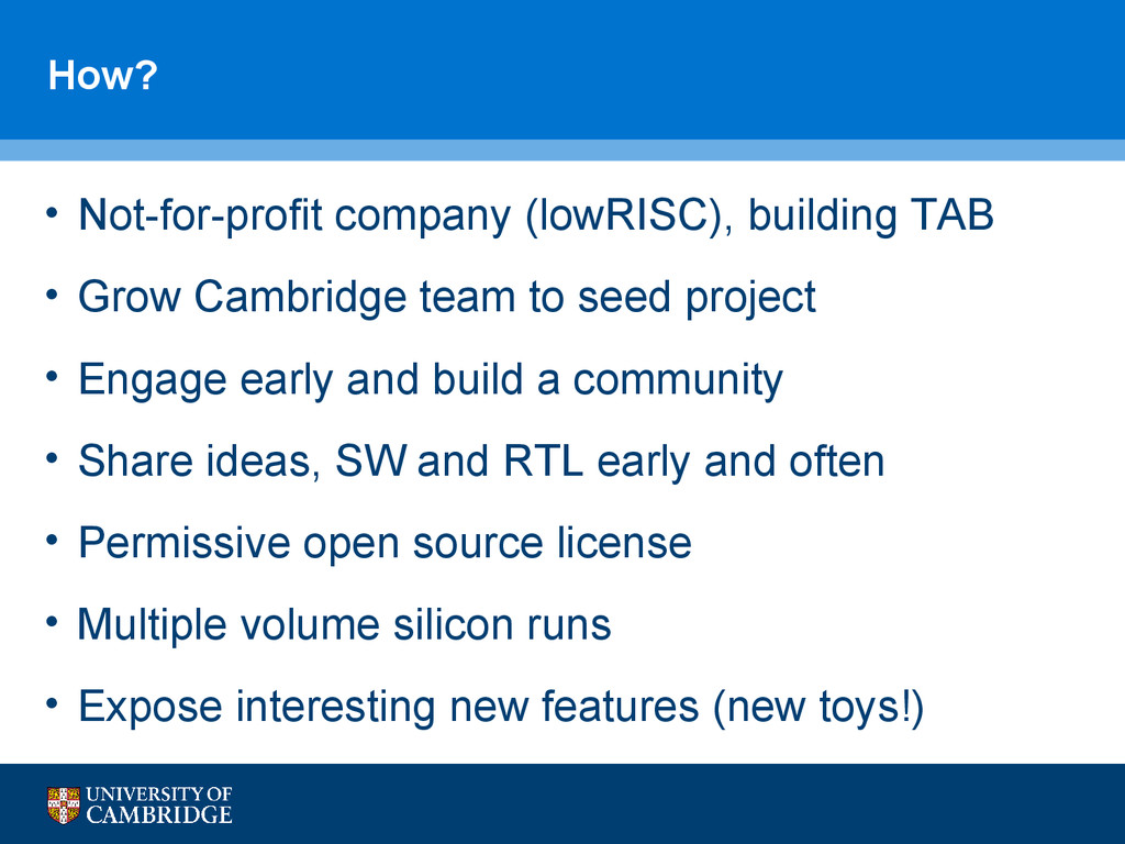 team to seed project • Engage early and build a community • Share ideas, SW and RTL early and often • Permissive open source license • Multiple volume silicon runs • Expose interesting new features (new toys!)