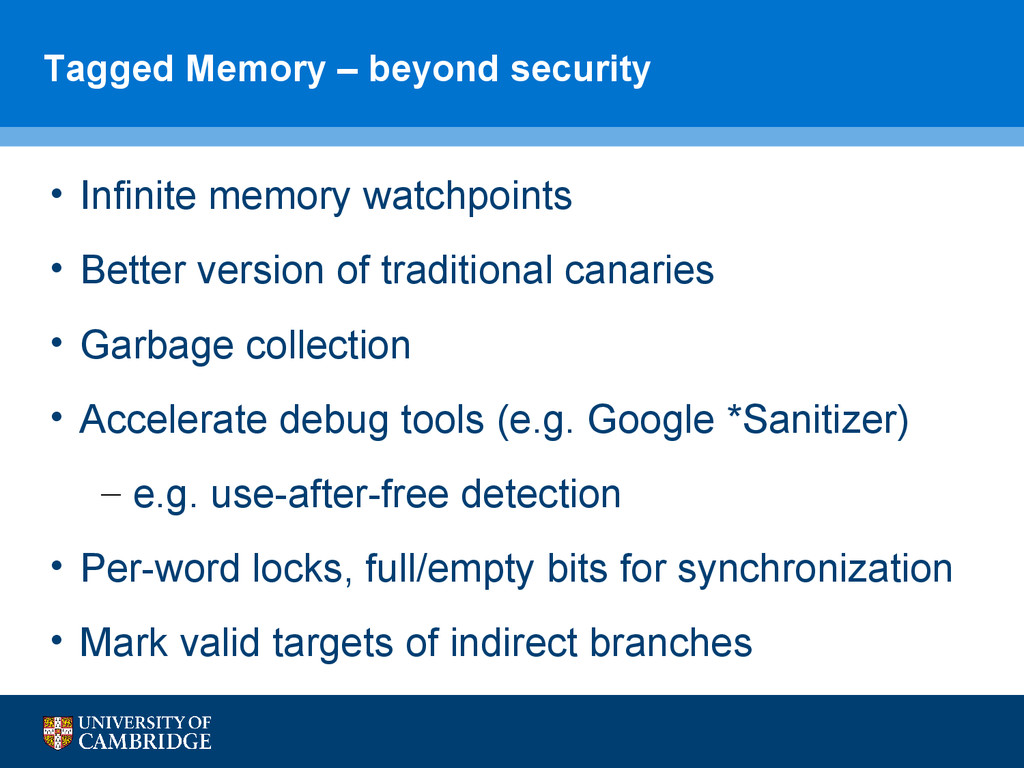 Better version of traditional canaries • Garbage collection • Accelerate debug tools (e.g. Google *Sanitizer) – e.g. use-after-free detection • Per-word locks, full/empty bits for synchronization • Mark valid targets of indirect branches