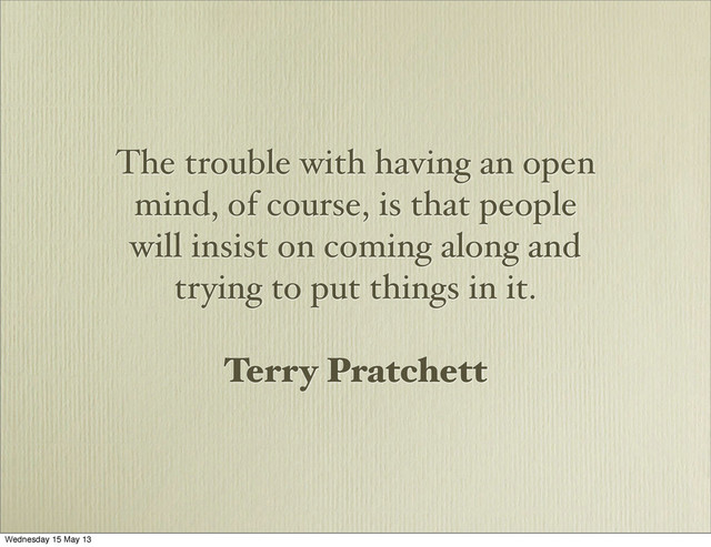 that alter them in place. • Composition requires work: interfaces. Yay. • Hides data away inside type hierarchy. • Noun-centric approach to problem solving. • Defines functions that transform generic data structures. • Composition is simple and natural. • Exposes data. • Verb-centric approach to problem solving. http://goo.gl/b9JkF Wednesday 15 May 13