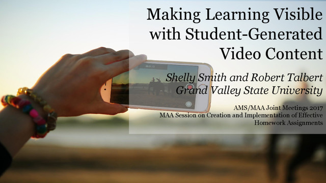 Having students create videos of themselves working out solutions to problems was used as a replacement or supplement to written homework solutions in Calculus 1 and Calculus 2 courses -- and the results were impressive. These are slides from a talk given by Robert Talbert and Shelly Smith at the AMS/MAA Joint Meetings in January 2017. A companion website, with links to materials, is at http://bit.ly/jmmvideo.