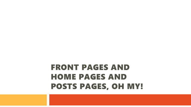 be a singular page (Posts Page) or an archive ▪ Okay, technically it’s always an archive ▪ May be the Front Page of your site, or may be a different page entirely. is_home();