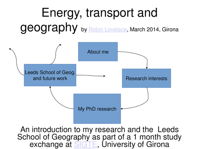 of volunteered geography. GeoJournal, 69(4). Heppenstall, A. J., Harland, K., Ross, A. N., & Olner, D. (2013). Simulating Spatial Dynamics and Processes in a Retail Gasoline Market: An Agent-Based Modeling Approach. Transactions in GIS, 17(5). Lovelace, R. et al. (2011). Assessing the energy implications of replacing car trips with bicycle trips in Sheffield, UK. Energy Policy, 39(4). Lovelace, R., & Ballas, D. (2013). “Truncate, replicate, sample”: A method for creating integer weights for spatial microsimulation. Computers, Environment and Urban Systems, 41, 1–11. Lovelace, R., Ballas, D., & Watson, M. (2014). A spatial microsimulation approach for the analysis of commuter patterns: from individual to regional levels. Journal of Transport Geography, 34(0), 282–296. Lovelace, R., & Philips, I. (2014). The “oil vulnerability” of commuter patterns: A case study from Yorkshire and the Humber, UK. Geoforum, 51(0), 169–182. Rockstrom, J et al. (2009). A safe operating space for humanity. Nature, 461(7263). Smil, V. (2008). Energy in nature and society. MIT. Smil, V. (1993). Global ecology: environmental change and social flexibility. Routledge.