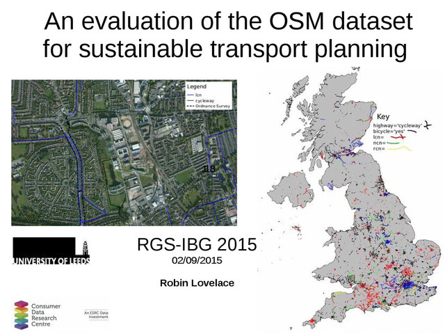 Ordnance Survey for provision of cycle path data • Wider point: crowd sourced data as THE standard? • Encourages public participation • Plans for further analysis and publication: – Spatial comparisons where OSM/OS overlap – Framing as crowd-sourced data becoming mainstream – Aiming for 'public engagement' as well as academic outputs – E.g. Lovelace (2014), CycleStreets.net blog, CTC – Making OSM data accessibe (see next session!)