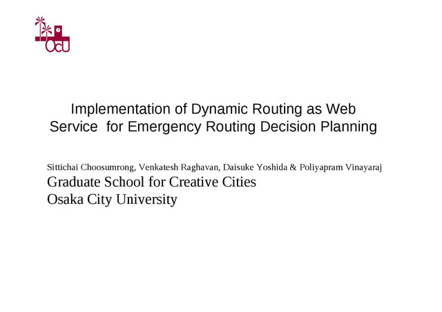 considering additional impedance factors such traffic volume, mass density, slope, snow etc. • Incorporation of other simulation and forecast model for fire spread, debris flow, tsunami and other natural disaster. Several models pertaining to such disaster are available in GRASS GIS and can be easily integrated into the ERDP as demonstrated in the present research. • Support for OGC Sensor Web Enablement (SWE) standards, wherein data such as CCTV cameras, weather stations etc. that could automatically be received from field and provide routing reflecting such data inputs. • Implementation of Web Service chaining framework from service discovery to execution, allowing the user to find-bind-publish geospatial information for ERDP.