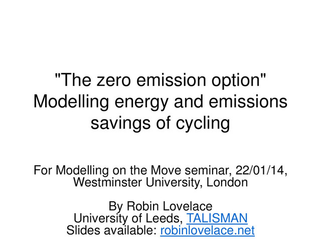 Question: We can’t burn half the world's oil, coal and gas. So how do we quit? Profile Books Coley, D. A. (2002). Emission factors for human activity. Energy policy, 30(1), 3-5. Greer, J. M. (2009). The Ecotechnic Future: Envisioning a Post-Peak World. Aztext Press. Lenzen, M. (1999). Total requirements of energy and greenhouse gases for Australian transport. Transportation Research Part D: Transport and Environment, 4(4), 265-290. Lovelace, R., Ballas, D., & Watson, M. (2013). A spatial microsimulation approach for the analysis of commuter patterns: from individual to regional levels. Journal of Transport Geography Lovelace, R., Beck, S. B. M. B. M., Watson, M., & Wild, A. (2011). Assessing the energy implications of replacing car trips with bicycle trips in Sheffield, UK. Energy Policy New email address: R . Lovelace @ Leeds . ac . uk