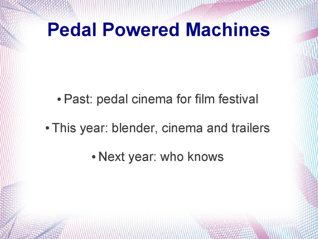 This was a talk I delivered in summer 2012 to summarise what EWB's Pedal Powered Machines, (PPM, https://ewb.shef.ac.uk/projects/pedal-powered-machines/ ) had done and what we plan. PPM continues!