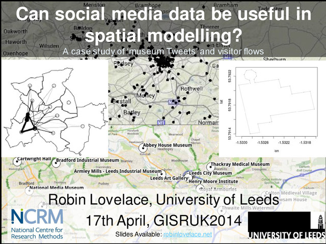 paper • Check Snowden, E. (2013). Interview with Glen Greenwald - Full Transcript. • Reproducible code available on rpubs.com/robinlovelace • See how to set up your very own 'Twitter Listener' • Check out the 'big data backlash' (Taleb 2012 on Wired.com) • Slides available from robinlovelace.net