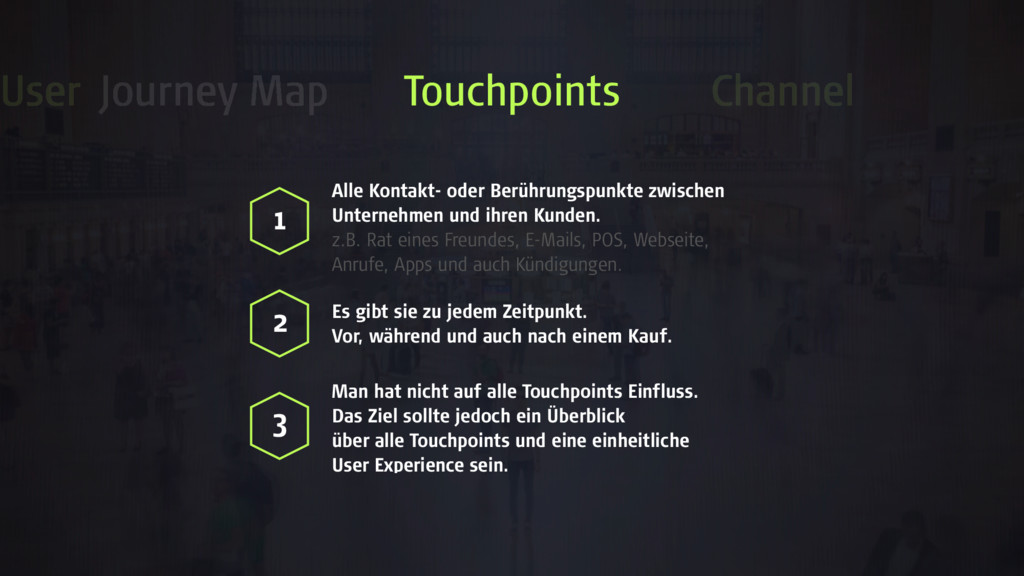 z.B. Rat eines Freundes, E-Mails, POS, Webseite, Anrufe, Apps und auch Kündigungen. 1 2 Es gibt sie zu jedem Zeitpunkt. Vor, während und auch nach einem Kauf. 3 Man hat nicht auf alle Touchpoints Einfluss. Das Ziel sollte jedoch ein Überblick über alle Touchpoints und eine einheitliche User Experience sein. Channel User Journey Map