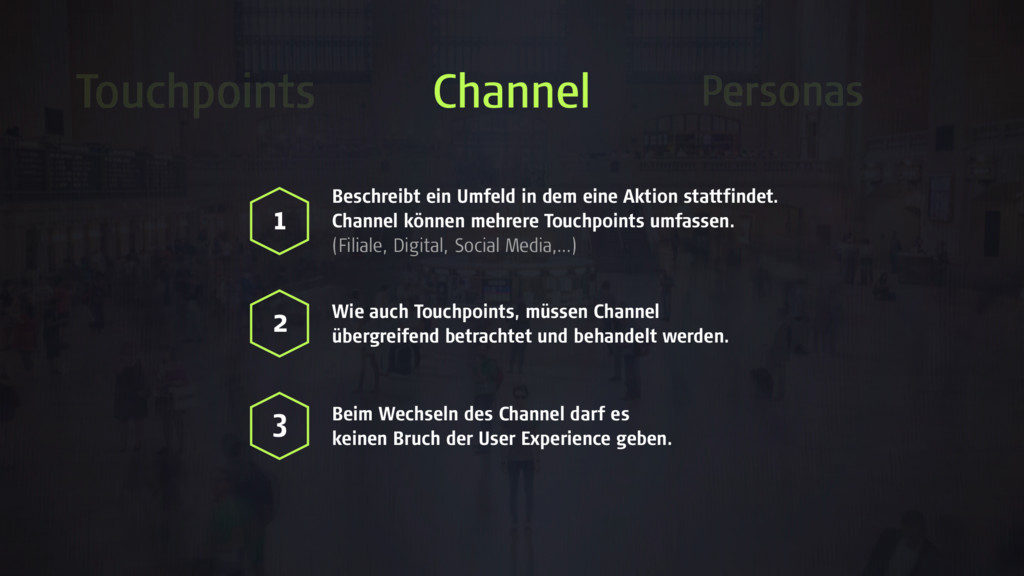 können mehrere Touchpoints umfassen. (Filiale, Digital, Social Media,…) 1 2 Wie auch Touchpoints, müssen Channel übergreifend betrachtet und behandelt werden. 3 Beim Wechseln des Channel darf es keinen Bruch der User Experience geben. Touchpoints Personas