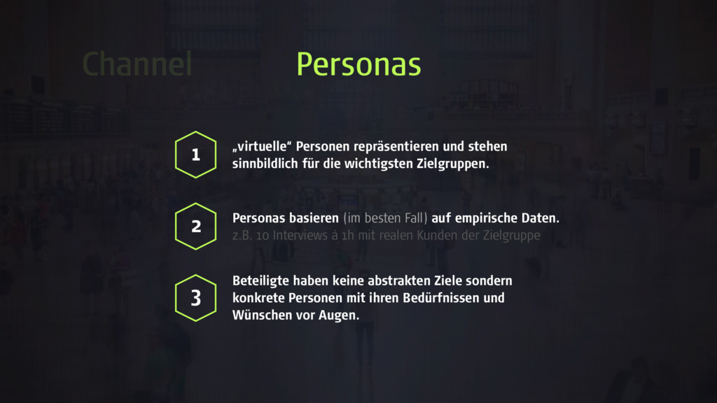 Zielgruppen. 1 2 Personas basieren (im besten Fall) auf empirische Daten. z.B. 10 Interviews á 1h mit realen Kunden der Zielgruppe 3 Beteiligte haben keine abstrakten Ziele sondern konkrete Personen mit ihren Bedürfnissen und Wünschen vor Augen. Channel