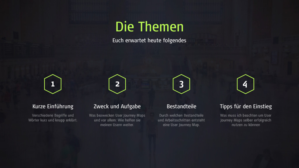 Verschiedene Begriffe und Wörter kurz und knapp erklärt. Zweck und Aufgabe Was bezwecken User Journey Maps und vor allem: Wie helfen sie meinen Usern weiter. Bestandteile Durch welchen Bestandteile und Arbeitsschritten entsteht eine User Journey Map. Tipps für den Einstieg Was muss ich beachten um User Journey Maps selber erfolgreich nutzen zu können Die Themen 1 2 3 4