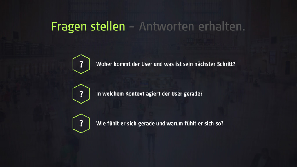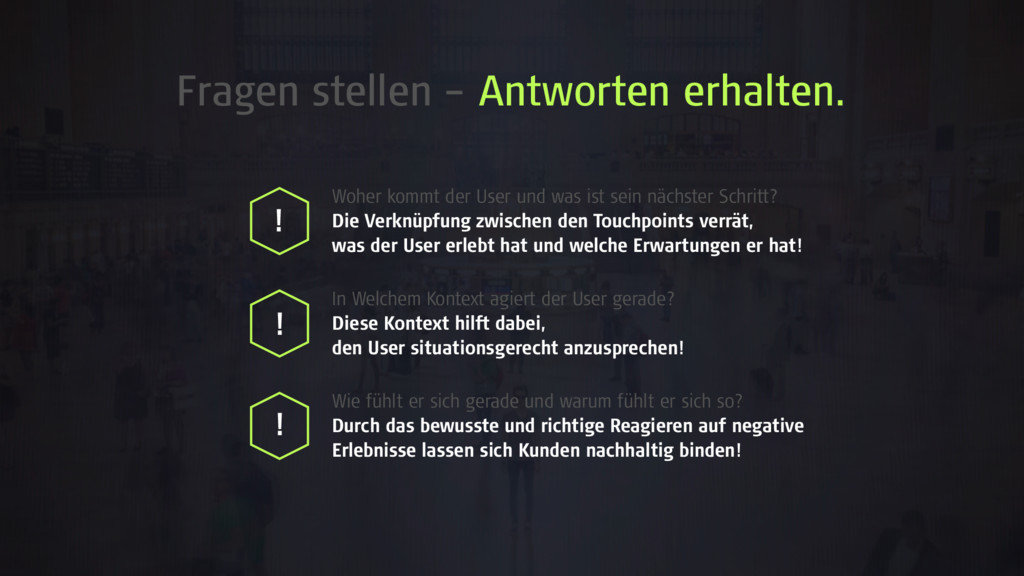 was ist sein nächster Schritt? Die Verknüpfung zwischen den Touchpoints verrät, was der User erlebt hat und welche Erwartungen er hat! In Welchem Kontext agiert der User gerade? Diese Kontext hilft dabei, den User situationsgerecht anzusprechen! Wie fühlt er sich gerade und warum fühlt er sich so? Durch das bewusste und richtige Reagieren auf negative Erlebnisse lassen sich Kunden nachhaltig binden! ! ! !