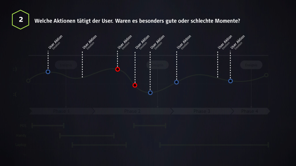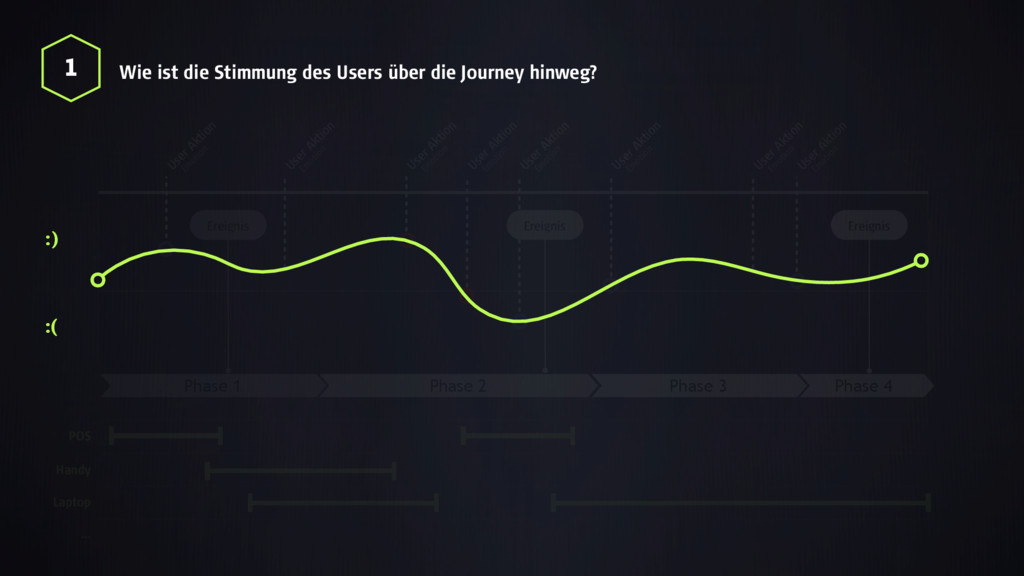 :) :( Ereignis Ereignis Phase 1 User Aktion User Aktion User Aktion User Aktion User Aktion User Aktion User Aktion User Aktion Em otion Em otion Em otion Em otion Em otion Em otion Em otion Em otion POS Handy Laptop … Phase 4 Ereignis :) :( 1 Wie ist die Stimmung des Users über die Journey hinweg?