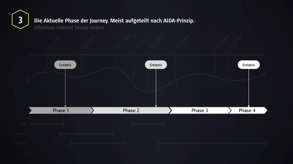:) :( Ereignis Ereignis Phase 1 User Aktion User Aktion User Aktion User Aktion User Aktion User Aktion User Aktion User Aktion Em otion Em otion Em otion Em otion Em otion Em otion Em otion Em otion POS Handy Laptop … Phase 4 Ereignis 3 Die Aktuelle Phase der Journey. Meist aufgeteilt nach AIDA-Prinzip. Attention Interest Desire Action Phase 3 Phase 2 Ereignis Ereignis Phase 1 Phase 4 Ereignis