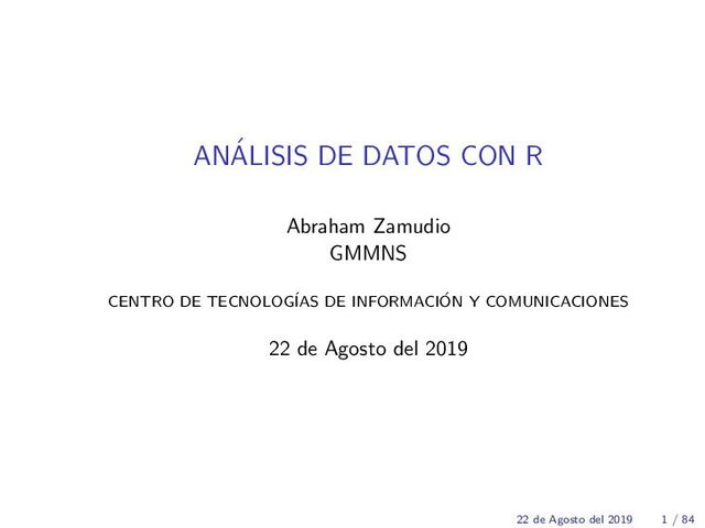 el factor m´ as importante que asegura el ´ exito en un negocio. Es dif´ ıcil mantenerse a ritmo en el tiempo. Pero, la tecnolog´ ıa ha desarrollado algunos m´ etodos poderosos con los cuales podemos ver cosas antes de tiempo.No estamos hablando de una maquina del tiempo !!!. Estamos hablando de los m´ etodos de predicci´ on y pron´ ostico. Estos m´ etodos, que se ocupan de datos basados en el tiempo, es decir, Modelamiento de Series de Tiempo. Como su nombre sugiere, implica trabajar en datos basados en el tiempo (a˜ nos, d´ ıas, horas, minutos) para obtener informaci´ on que se encuentra oculta y as´ ı tomar decisiones con mejor informaci´ on. 22 de Agosto del 2019 2 / 84