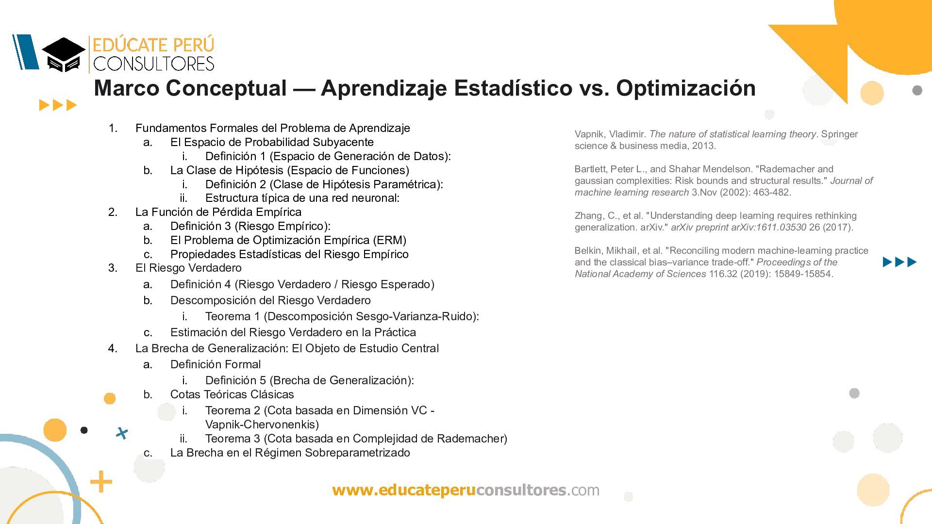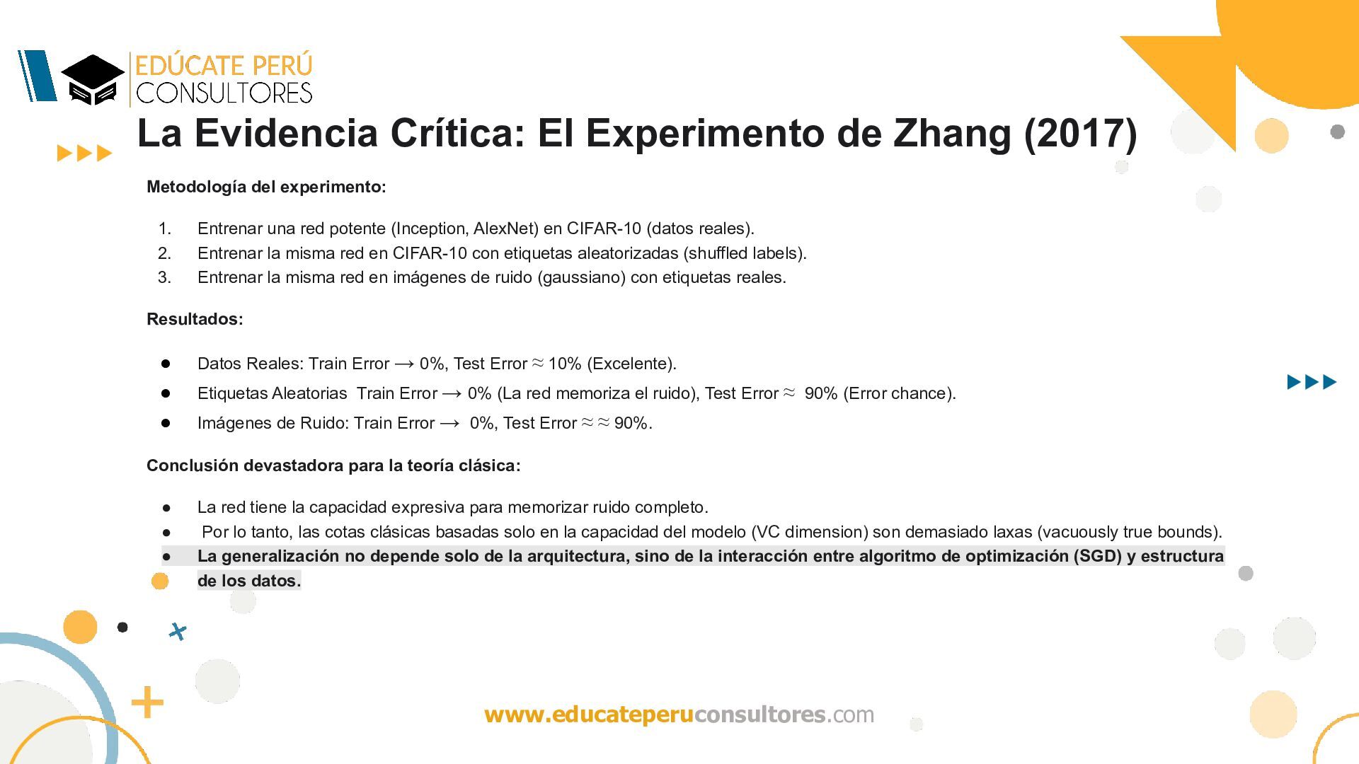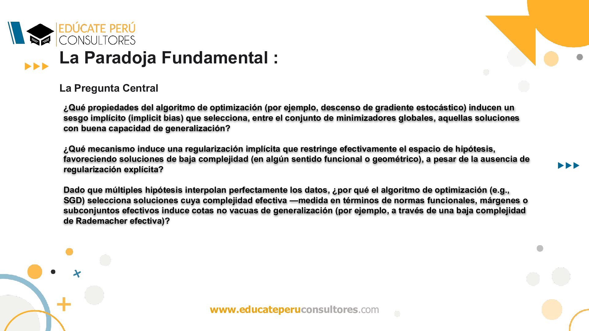 del algoritmo de optimización (por ejemplo, descenso de gradiente estocástico) inducen un sesgo implícito (implicit bias) que selecciona, entre el conjunto de minimizadores globales, aquellas soluciones con buena capacidad de generalización? ¿Qué mecanismo induce una regularización implícita que restringe efectivamente el espacio de hipótesis, favoreciendo soluciones de baja complejidad (en algún sentido funcional o geométrico), a pesar de la ausencia de regularización explícita? Dado que múltiples hipótesis interpolan perfectamente los datos, ¿por qué el algoritmo de optimización (e.g., SGD) selecciona soluciones cuya complejidad efectiva —medida en términos de normas funcionales, márgenes o subconjuntos efectivos induce cotas no vacuas de generalización (por ejemplo, a través de una baja complejidad de Rademacher efectiva)?