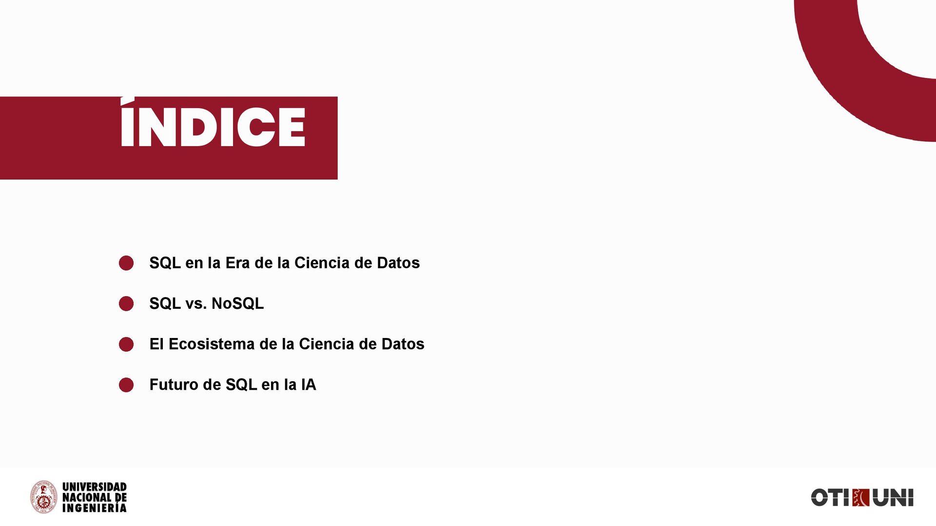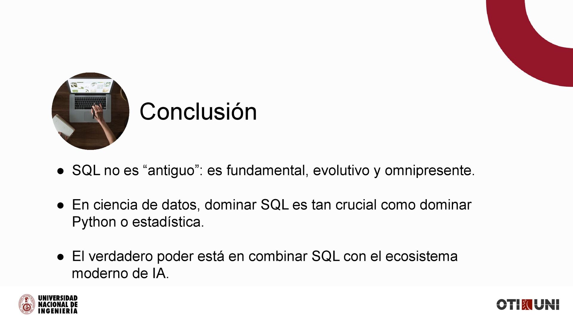 omnipresente. • En ciencia de datos, dominar SQL es tan crucial como dominar Python o estadística. • El verdadero poder está en combinar SQL con el ecosistema moderno de IA.
