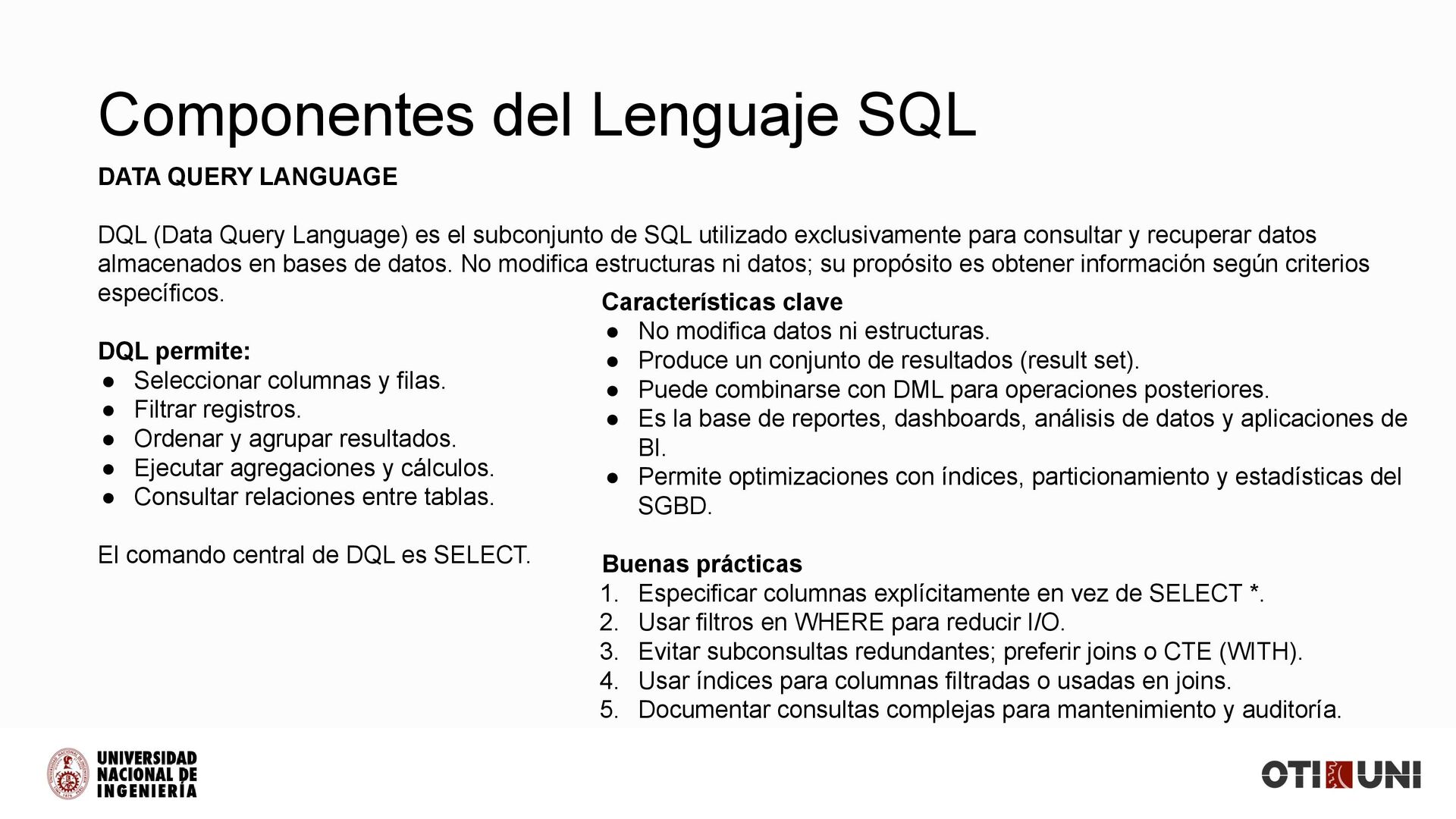 Language) es el subconjunto de SQL utilizado exclusivamente para consultar y recuperar datos almacenados en bases de datos. No modifica estructuras ni datos; su propósito es obtener información según criterios específicos. DQL permite: • Seleccionar columnas y filas. • Filtrar registros. • Ordenar y agrupar resultados. • Ejecutar agregaciones y cálculos. • Consultar relaciones entre tablas. El comando central de DQL es SELECT. Características clave • No modifica datos ni estructuras. • Produce un conjunto de resultados (result set). • Puede combinarse con DML para operaciones posteriores. • Es la base de reportes, dashboards, análisis de datos y aplicaciones de BI. • Permite optimizaciones con índices, particionamiento y estadísticas del SGBD. Buenas prácticas 1. Especificar columnas explícitamente en vez de SELECT *. 2. Usar filtros en WHERE para reducir I/O. 3. Evitar subconsultas redundantes; preferir joins o CTE (WITH). 4. Usar índices para columnas filtradas o usadas en joins. 5. Documentar consultas complejas para mantenimiento y auditoría.