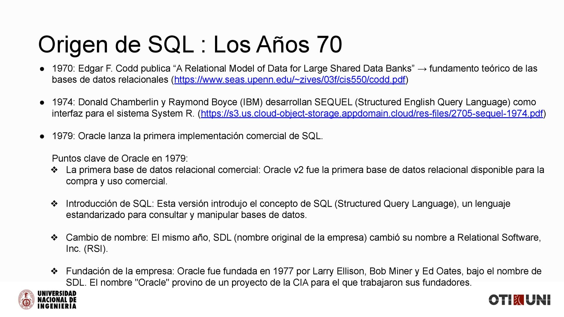 F. Codd publica “A Relational Model of Data for Large Shared Data Banks” → fundamento teórico de las bases de datos relacionales (https://www.seas.upenn.edu/~zives/03f/cis550/codd.pdf) • 1974: Donald Chamberlin y Raymond Boyce (IBM) desarrollan SEQUEL (Structured English Query Language) como interfaz para el sistema System R. (https://s3.us.cloud-object-storage.appdomain.cloud/res-files/2705-sequel-1974.pdf) • 1979: Oracle lanza la primera implementación comercial de SQL. Puntos clave de Oracle en 1979: ❖ La primera base de datos relacional comercial: Oracle v2 fue la primera base de datos relacional disponible para la compra y uso comercial. ❖ Introducción de SQL: Esta versión introdujo el concepto de SQL (Structured Query Language), un lenguaje estandarizado para consultar y manipular bases de datos. ❖ Cambio de nombre: El mismo año, SDL (nombre original de la empresa) cambió su nombre a Relational Software, Inc. (RSI). ❖ Fundación de la empresa: Oracle fue fundada en 1977 por Larry Ellison, Bob Miner y Ed Oates, bajo el nombre de SDL. El nombre "Oracle" provino de un proyecto de la CIA para el que trabajaron sus fundadores.
