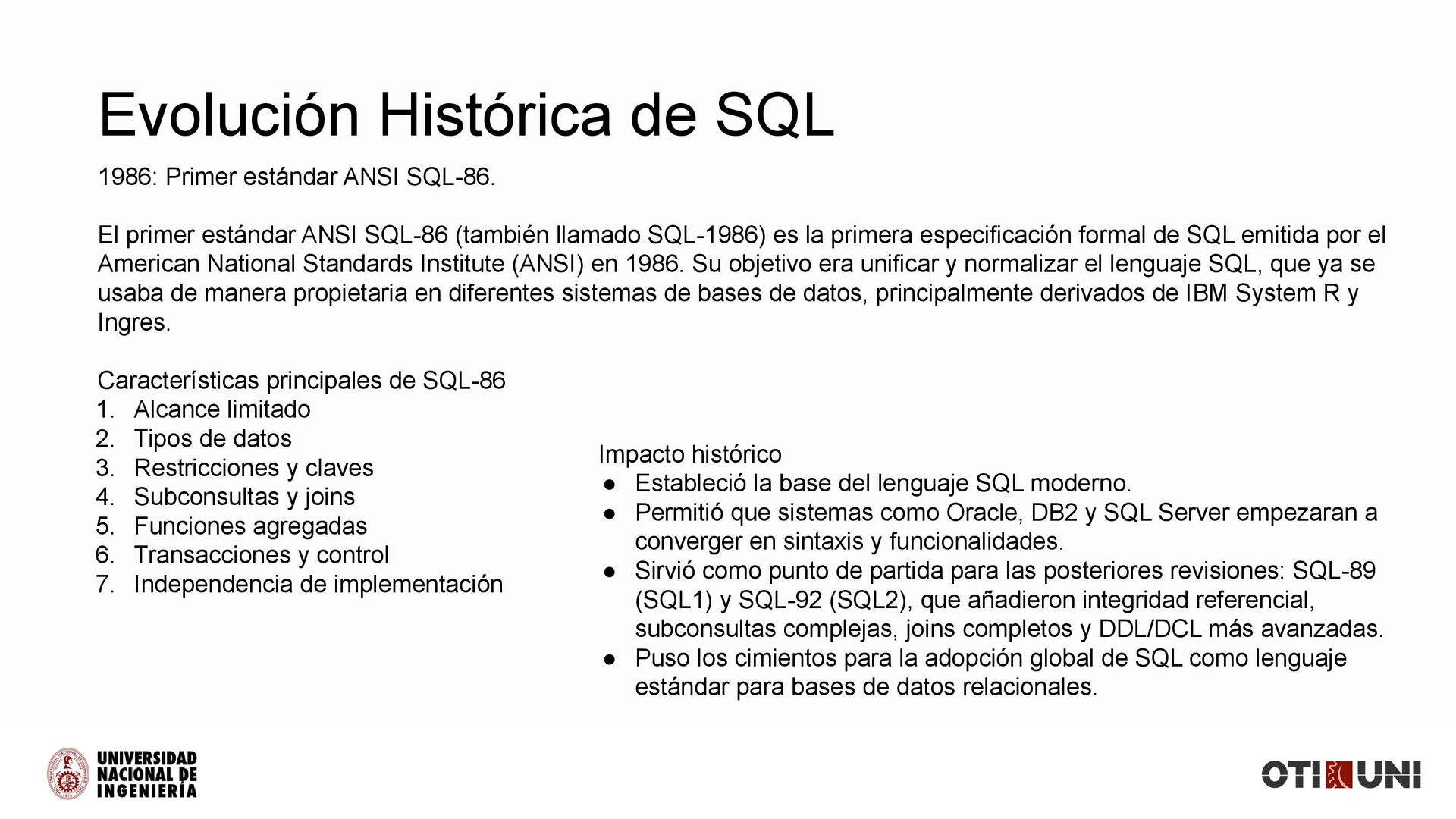 primer estándar ANSI SQL-86 (también llamado SQL-1986) es la primera especificación formal de SQL emitida por el American National Standards Institute (ANSI) en 1986. Su objetivo era unificar y normalizar el lenguaje SQL, que ya se usaba de manera propietaria en diferentes sistemas de bases de datos, principalmente derivados de IBM System R y Ingres. Características principales de SQL-86 1. Alcance limitado 2. Tipos de datos 3. Restricciones y claves 4. Subconsultas y joins 5. Funciones agregadas 6. Transacciones y control 7. Independencia de implementación Impacto histórico • Estableció la base del lenguaje SQL moderno. • Permitió que sistemas como Oracle, DB2 y SQL Server empezaran a converger en sintaxis y funcionalidades. • Sirvió como punto de partida para las posteriores revisiones: SQL-89 (SQL1) y SQL-92 (SQL2), que añadieron integridad referencial, subconsultas complejas, joins completos y DDL/DCL más avanzadas. • Puso los cimientos para la adopción global de SQL como lenguaje estándar para bases de datos relacionales.