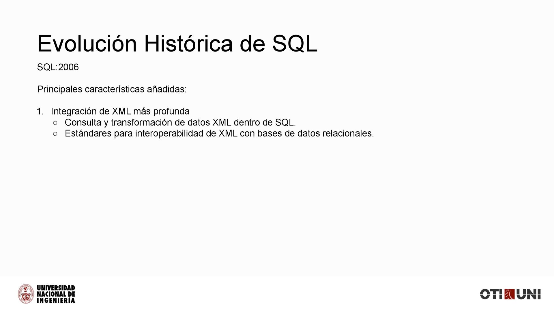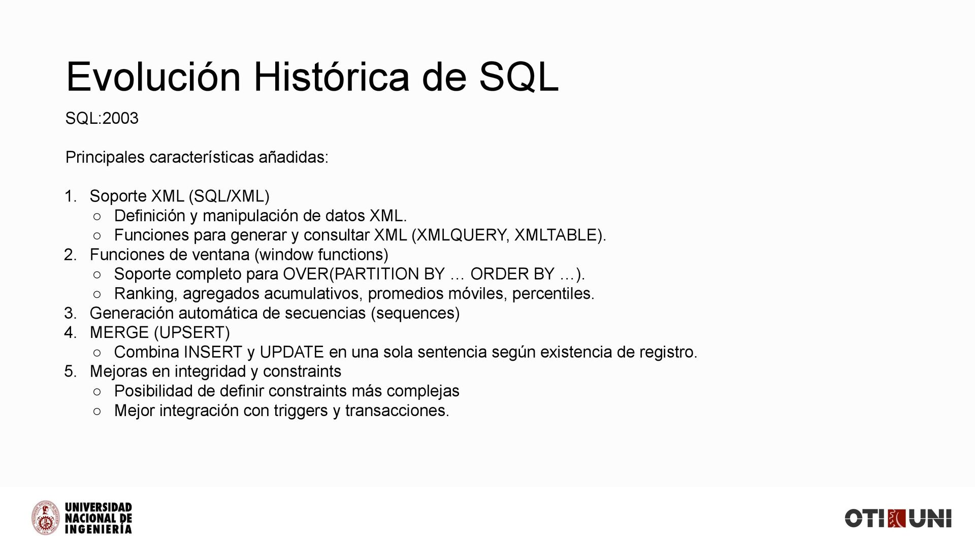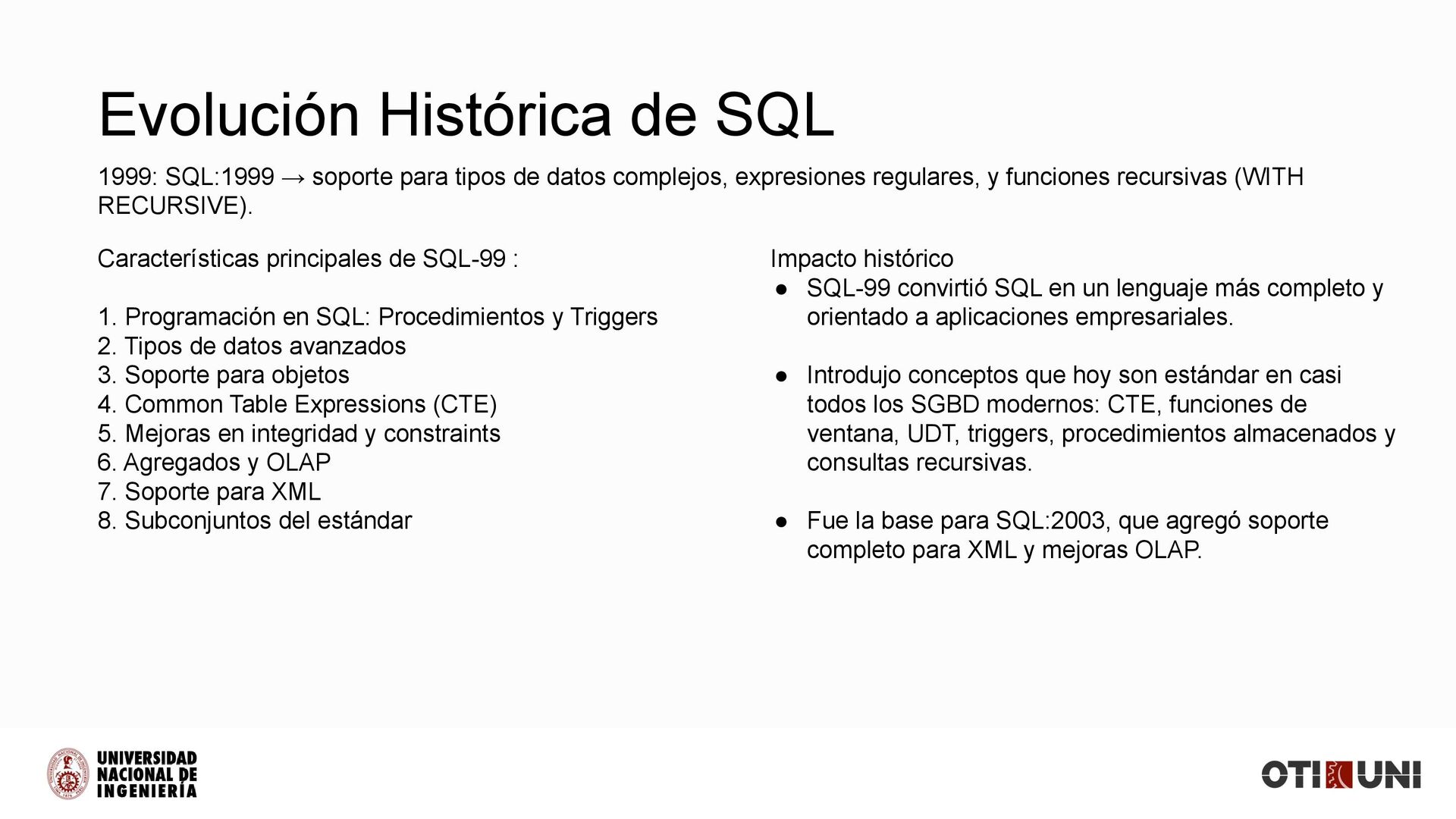 de datos complejos, expresiones regulares, y funciones recursivas (WITH RECURSIVE). Características principales de SQL-99 : 1. Programación en SQL: Procedimientos y Triggers 2. Tipos de datos avanzados 3. Soporte para objetos 4. Common Table Expressions (CTE) 5. Mejoras en integridad y constraints 6. Agregados y OLAP 7. Soporte para XML 8. Subconjuntos del estándar Impacto histórico • SQL-99 convirtió SQL en un lenguaje más completo y orientado a aplicaciones empresariales. • Introdujo conceptos que hoy son estándar en casi todos los SGBD modernos: CTE, funciones de ventana, UDT, triggers, procedimientos almacenados y consultas recursivas. • Fue la base para SQL:2003, que agregó soporte completo para XML y mejoras OLAP.
