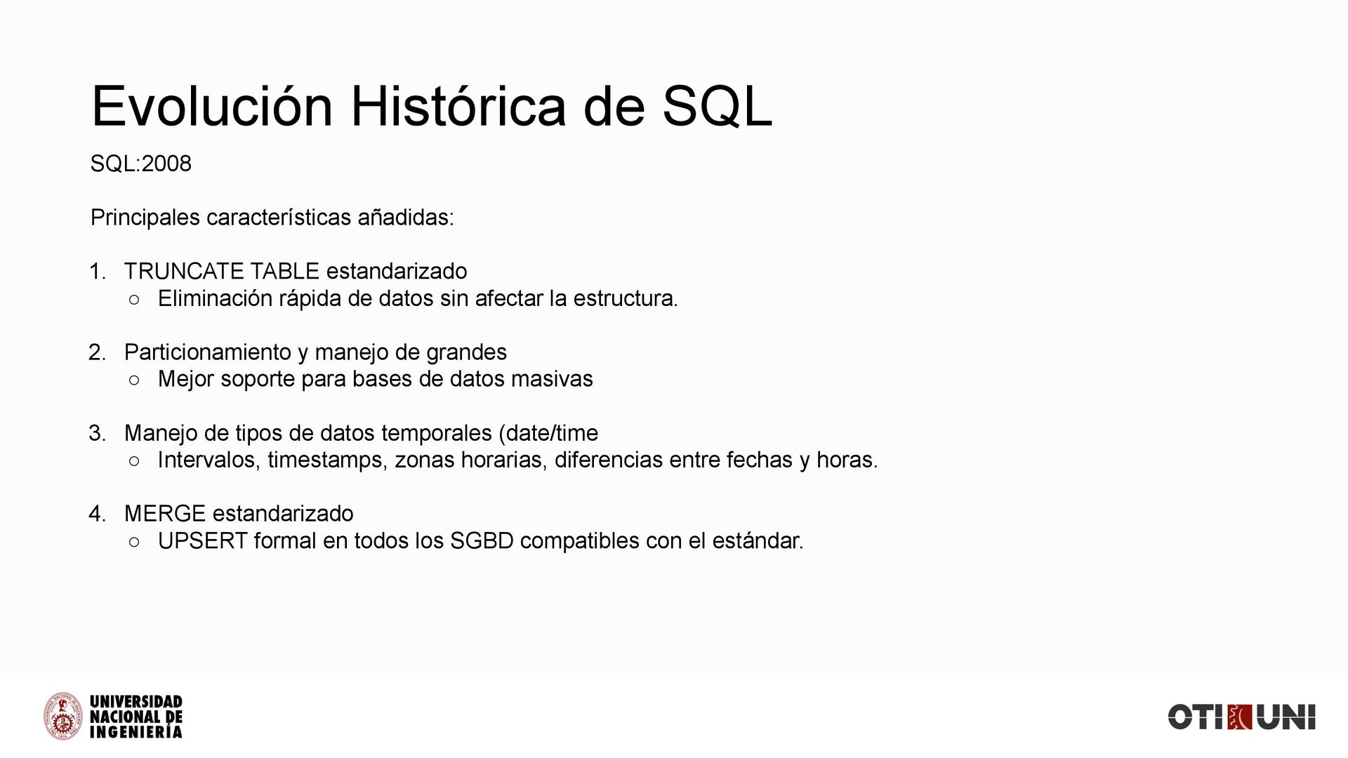 TABLE estandarizado ◦ Eliminación rápida de datos sin afectar la estructura. 2. Particionamiento y manejo de grandes ◦ Mejor soporte para bases de datos masivas 3. Manejo de tipos de datos temporales (date/time ◦ Intervalos, timestamps, zonas horarias, diferencias entre fechas y horas. 4. MERGE estandarizado ◦ UPSERT formal en todos los SGBD compatibles con el estándar.