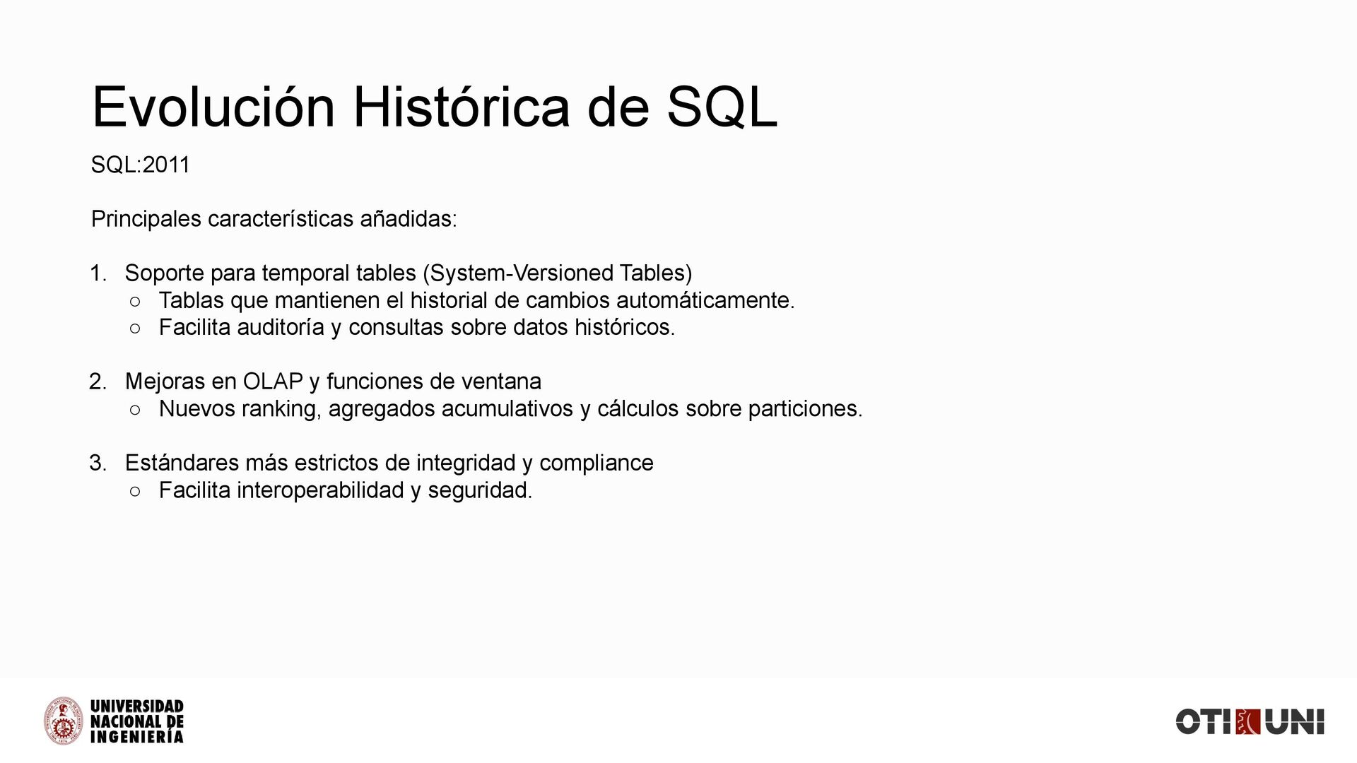 para temporal tables (System-Versioned Tables) ◦ Tablas que mantienen el historial de cambios automáticamente. ◦ Facilita auditoría y consultas sobre datos históricos. 2. Mejoras en OLAP y funciones de ventana ◦ Nuevos ranking, agregados acumulativos y cálculos sobre particiones. 3. Estándares más estrictos de integridad y compliance ◦ Facilita interoperabilidad y seguridad.