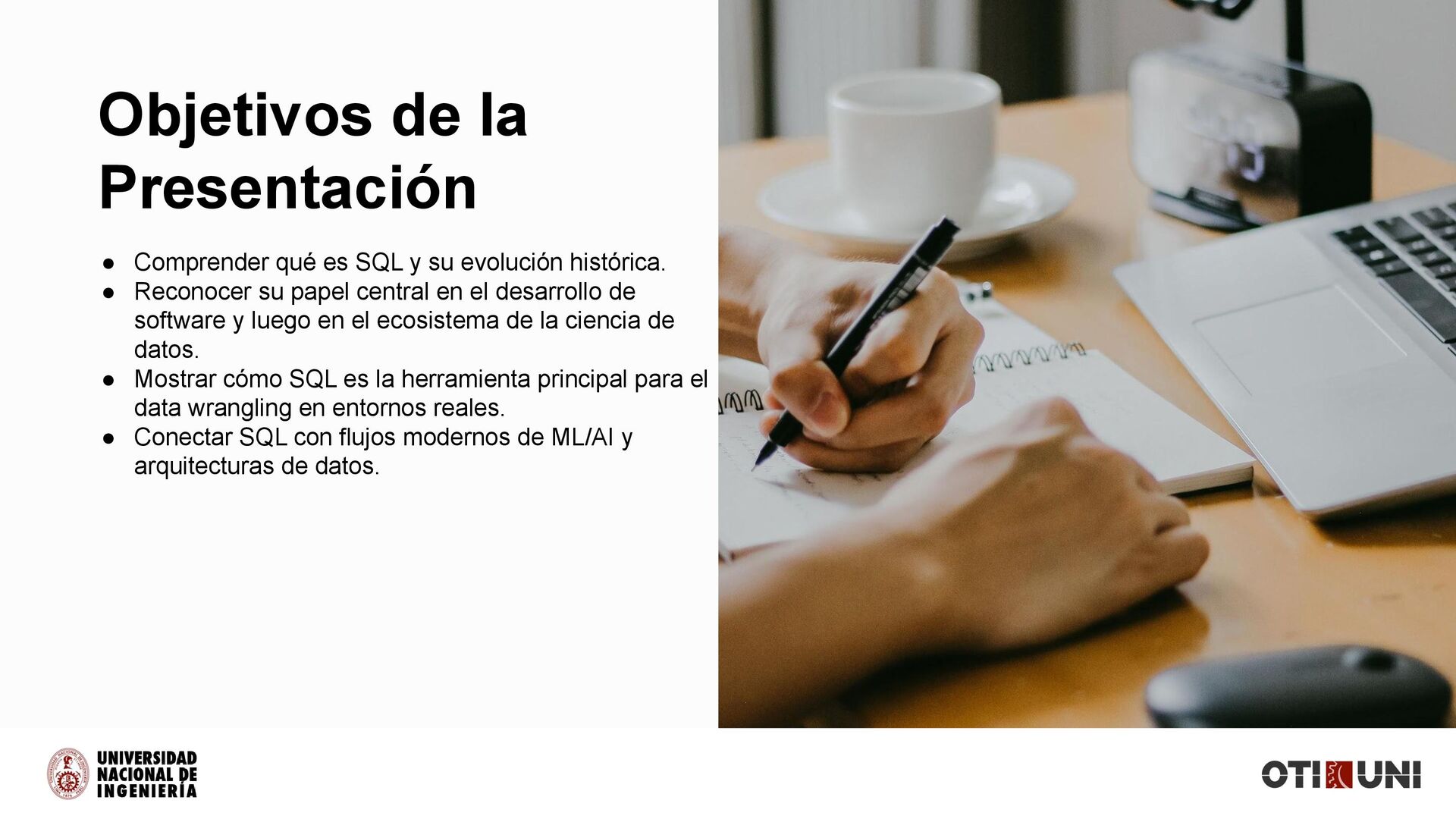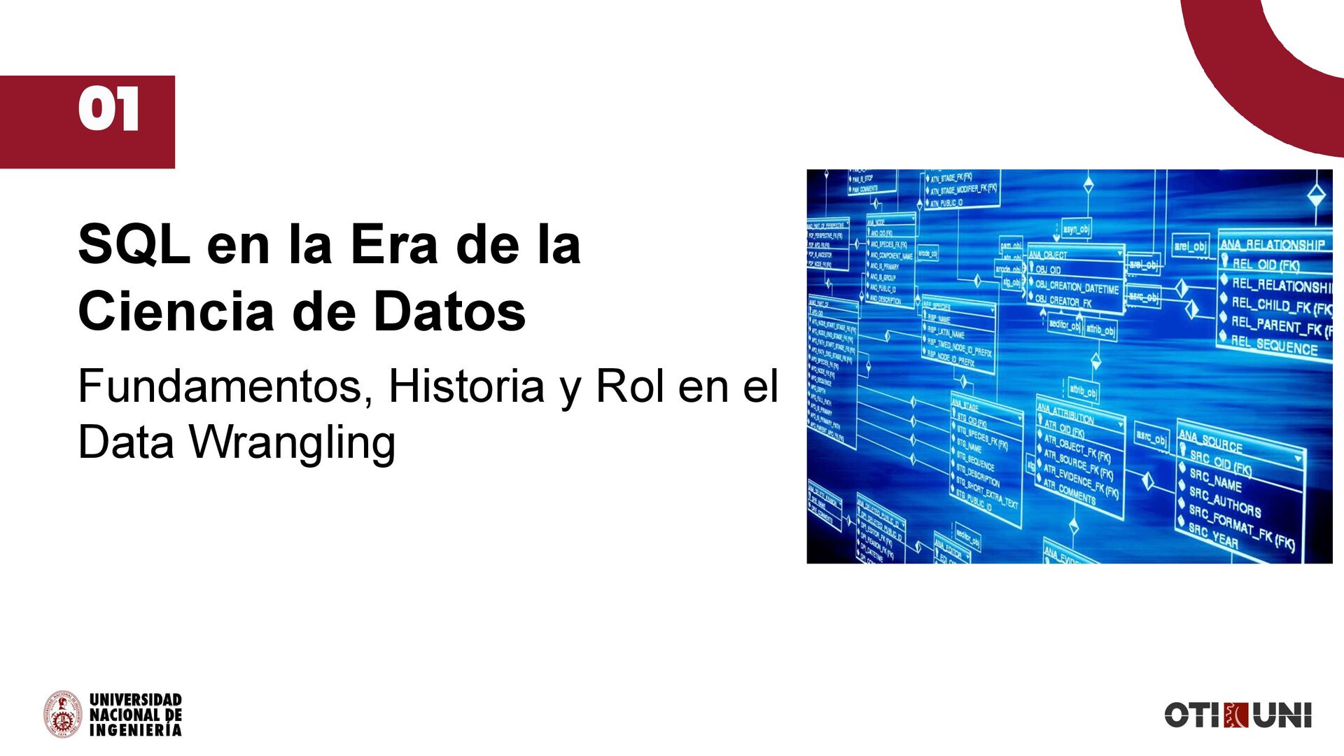 su evolución histórica. • Reconocer su papel central en el desarrollo de software y luego en el ecosistema de la ciencia de datos. • Mostrar cómo SQL es la herramienta principal para el data wrangling en entornos reales. • Conectar SQL con flujos modernos de ML/AI y arquitecturas de datos.