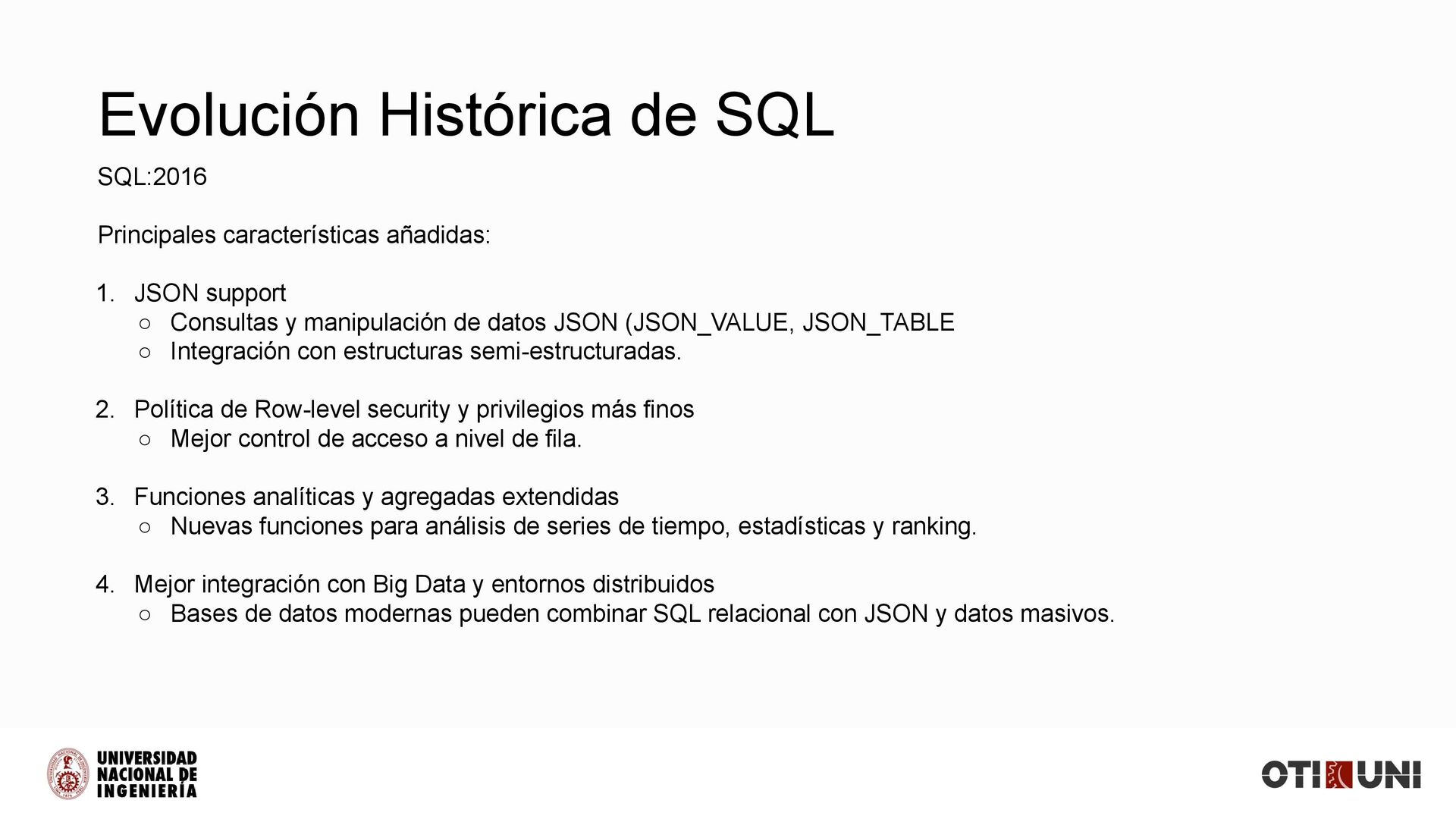 support ◦ Consultas y manipulación de datos JSON (JSON_VALUE, JSON_TABLE ◦ Integración con estructuras semi-estructuradas. 2. Política de Row-level security y privilegios más finos ◦ Mejor control de acceso a nivel de fila. 3. Funciones analíticas y agregadas extendidas ◦ Nuevas funciones para análisis de series de tiempo, estadísticas y ranking. 4. Mejor integración con Big Data y entornos distribuidos ◦ Bases de datos modernas pueden combinar SQL relacional con JSON y datos masivos.