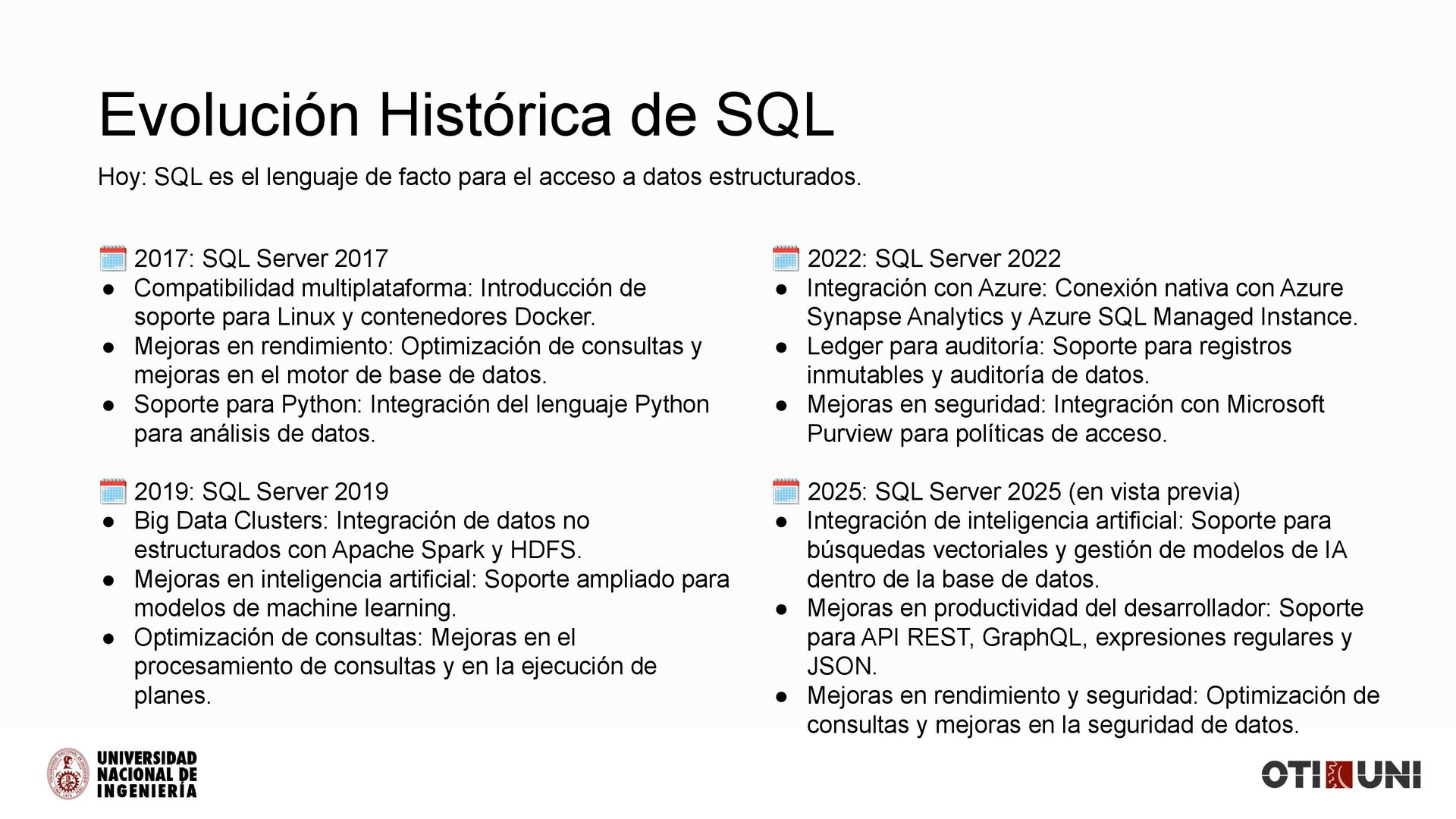facto para el acceso a datos estructurados. 🗓 2017: SQL Server 2017 • Compatibilidad multiplataforma: Introducción de soporte para Linux y contenedores Docker. • Mejoras en rendimiento: Optimización de consultas y mejoras en el motor de base de datos. • Soporte para Python: Integración del lenguaje Python para análisis de datos. 🗓 2019: SQL Server 2019 • Big Data Clusters: Integración de datos no estructurados con Apache Spark y HDFS. • Mejoras en inteligencia artificial: Soporte ampliado para modelos de machine learning. • Optimización de consultas: Mejoras en el procesamiento de consultas y en la ejecución de planes. 🗓 2022: SQL Server 2022 • Integración con Azure: Conexión nativa con Azure Synapse Analytics y Azure SQL Managed Instance. • Ledger para auditoría: Soporte para registros inmutables y auditoría de datos. • Mejoras en seguridad: Integración con Microsoft Purview para políticas de acceso. 🗓 2025: SQL Server 2025 (en vista previa) • Integración de inteligencia artificial: Soporte para búsquedas vectoriales y gestión de modelos de IA dentro de la base de datos. • Mejoras en productividad del desarrollador: Soporte para API REST, GraphQL, expresiones regulares y JSON. • Mejoras en rendimiento y seguridad: Optimización de consultas y mejoras en la seguridad de datos.