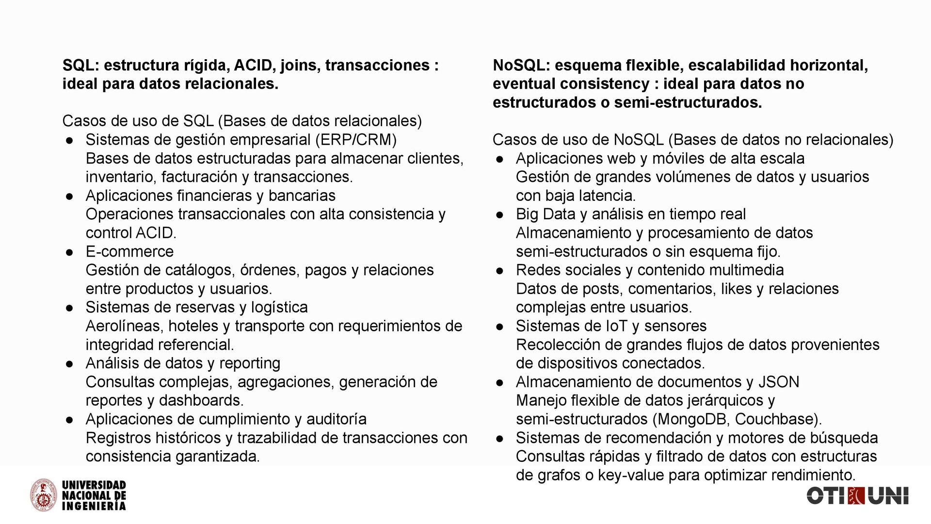 relacionales. Casos de uso de SQL (Bases de datos relacionales) • Sistemas de gestión empresarial (ERP/CRM) Bases de datos estructuradas para almacenar clientes, inventario, facturación y transacciones. • Aplicaciones financieras y bancarias Operaciones transaccionales con alta consistencia y control ACID. • E-commerce Gestión de catálogos, órdenes, pagos y relaciones entre productos y usuarios. • Sistemas de reservas y logística Aerolíneas, hoteles y transporte con requerimientos de integridad referencial. • Análisis de datos y reporting Consultas complejas, agregaciones, generación de reportes y dashboards. • Aplicaciones de cumplimiento y auditoría Registros históricos y trazabilidad de transacciones con consistencia garantizada. NoSQL: esquema flexible, escalabilidad horizontal, eventual consistency : ideal para datos no estructurados o semi-estructurados. Casos de uso de NoSQL (Bases de datos no relacionales) • Aplicaciones web y móviles de alta escala Gestión de grandes volúmenes de datos y usuarios con baja latencia. • Big Data y análisis en tiempo real Almacenamiento y procesamiento de datos semi-estructurados o sin esquema fijo. • Redes sociales y contenido multimedia Datos de posts, comentarios, likes y relaciones complejas entre usuarios. • Sistemas de IoT y sensores Recolección de grandes flujos de datos provenientes de dispositivos conectados. • Almacenamiento de documentos y JSON Manejo flexible de datos jerárquicos y semi-estructurados (MongoDB, Couchbase). • Sistemas de recomendación y motores de búsqueda Consultas rápidas y filtrado de datos con estructuras de grafos o key-value para optimizar rendimiento.